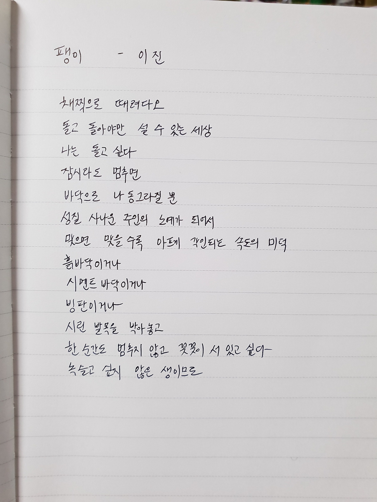 나는 어디까지 나를 몰아치면서 살아볼까. 내게 역시 '녹슬고 싶지 않은 생'을. 시인은 "잠시라도 멈추면 바닥으로 나동그라질 뿐"이라 했다. 나는 멈춰서 바닥으로 나동그라져도 상관 없다. 다만 녹슬고 싶지는 않다.