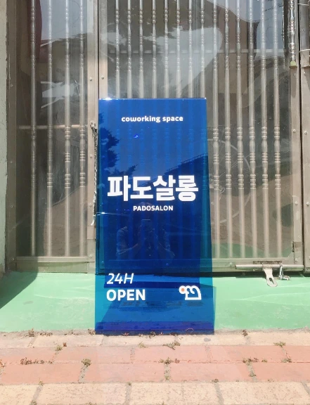 25분 정도 걸어 파도살롱에 도착했다. 철문 앞에 '파도살롱'이라는 쓰여 있는 파란색 아크릴 입간판이 서 있었다. 상큼했다. 그런데 문득, 이름과는 달리 파도와 바다가 보이지 않는 게 이상하다고 생각했다. 시내에 있는데 이름을 왜 파도살롱으로 지었을까? 작명 프로세스에 대해 혼자 진지하게 생각했다.