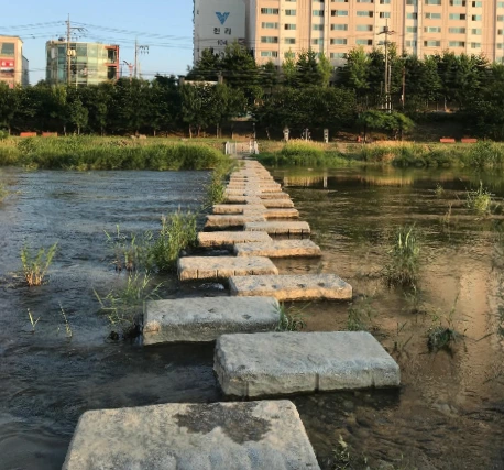 만약 아까 내곡교를 건너지 않고 바로 내려온 상태라면, 1킬로미터 남짓 걷다가 징검다리를 건너게 된다. 가물 때는 천이 거의 말라 있어 징검다리 건너기 난이도가 최하이지만, 비온 후에는 징검다리 표면까지 물이 찰랑찰랑해서 좀 무섭다. 물론 비가 많이 오면 징검다리가 침수돼 건널 수 없다. 징검다리를 건너다 건너편에서 오는 사람이 돌 세 개 앞까지 오면 가만히 멈춰 먼저 가도록 기다린다.