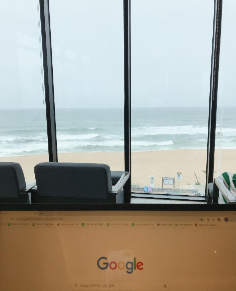 다 먹고 또다시 길을 걸어 드디어 강문해변에 도착했다. 스타벅스에 들어가 3층에 자리 잡았다. 창 너머로 파도가 아주 높게 치는 바다가 보였다. 사람들이 전부 바다 쪽을 보고 앉아 있었다. 나도 바다가 내다보이는 좌석에 앉아 노트북을 켰다.