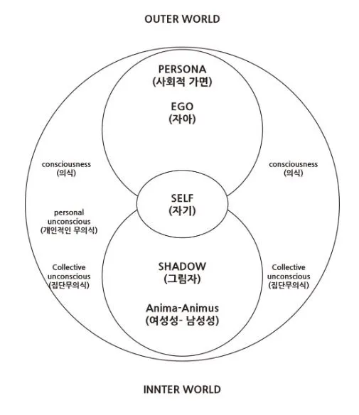 원형(archetypes)은 내용을 가지고 있지 않으며 형태만 가지고 있다. 성격과 행동에 중요한 영향을 미치는 5가지 원형 가운데 페르소나(persona)와 그림자(shadow), 자기(Self)가 있다.