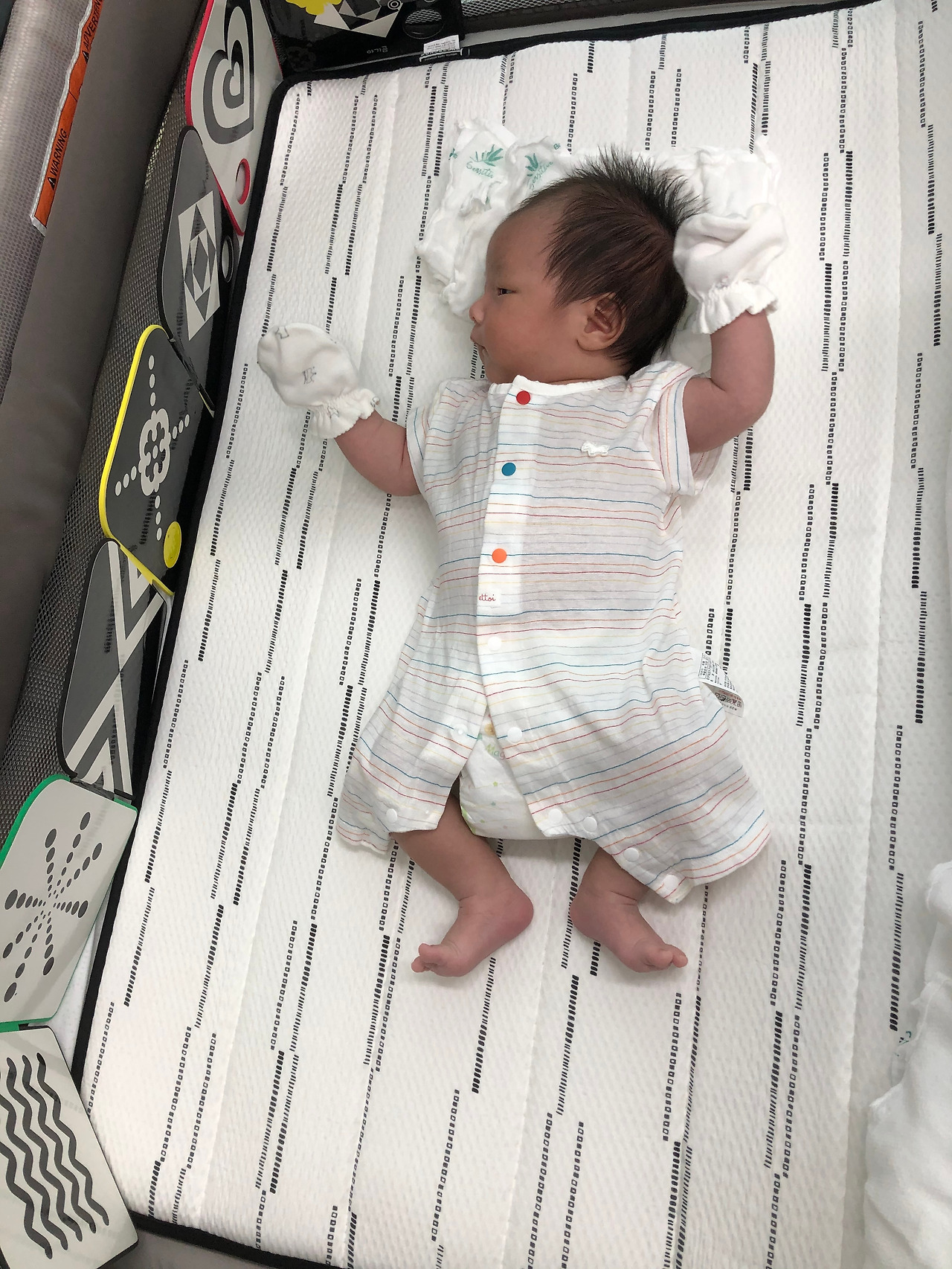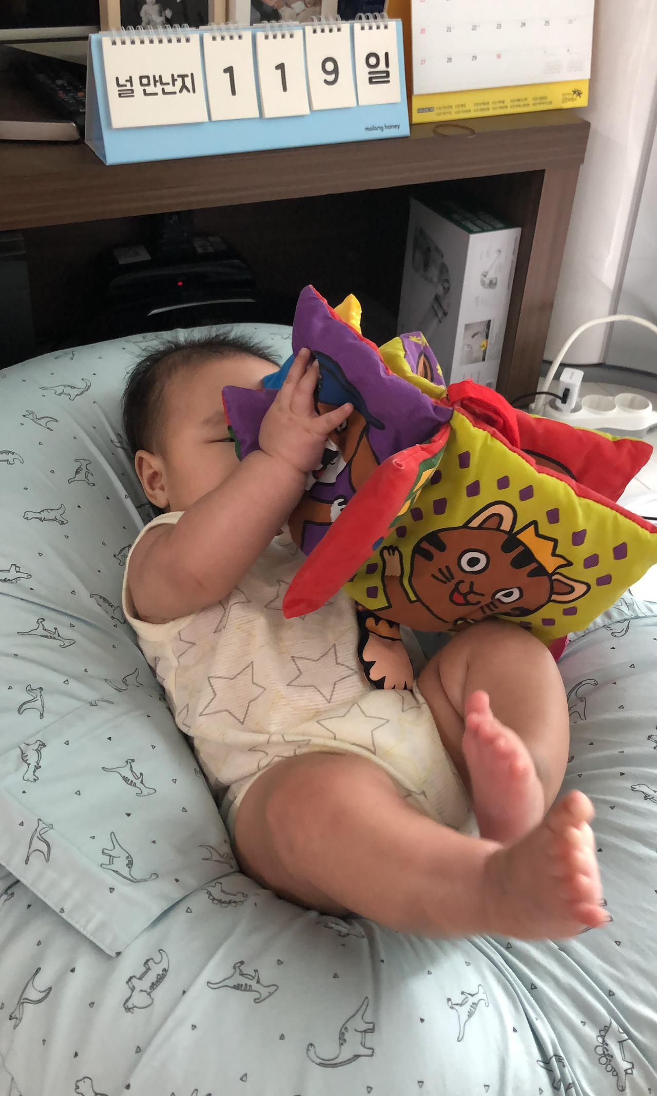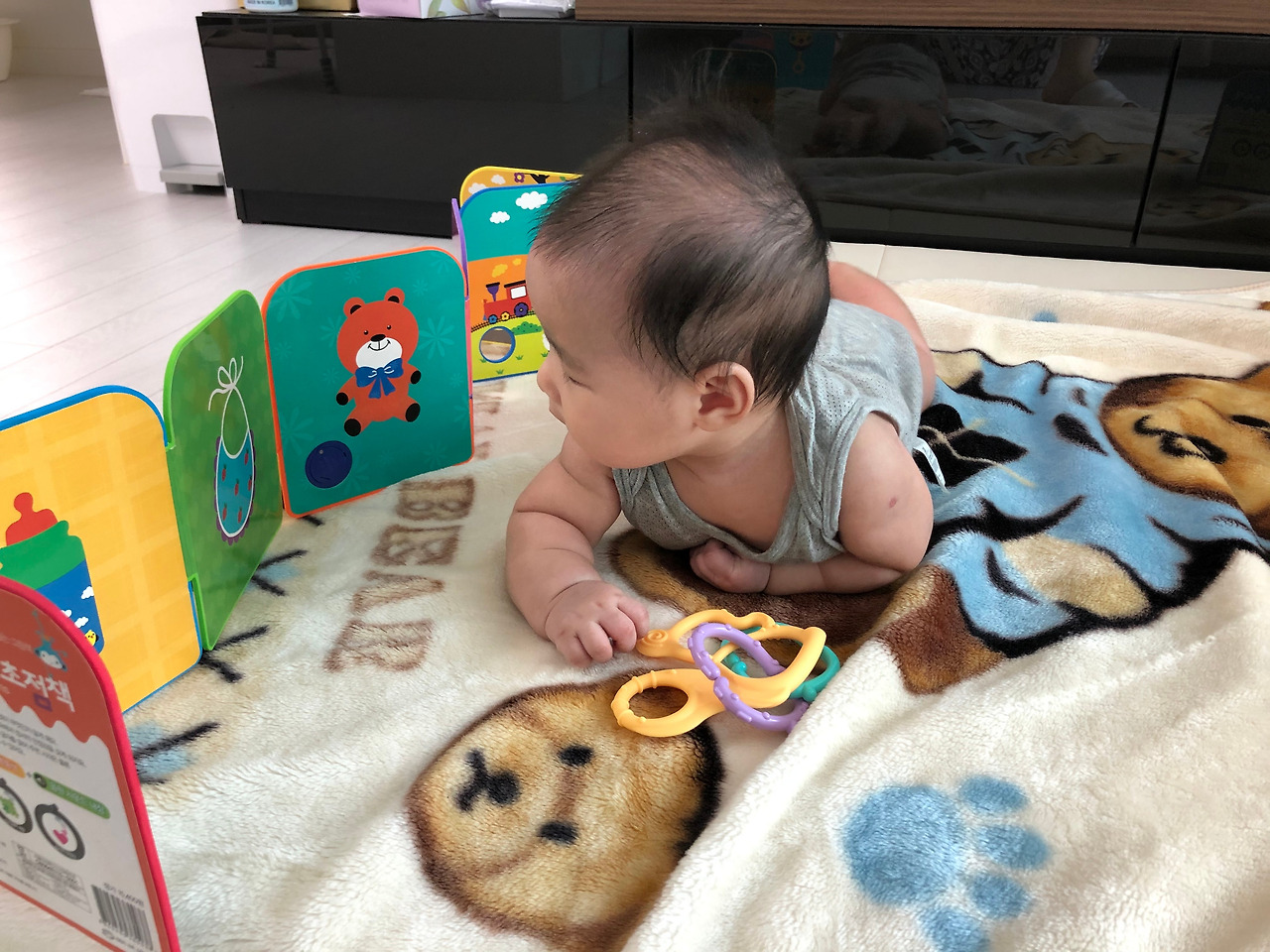 우리 아이의 경우 누워있던 시절 최애라고 쓰고 유이한 장난감은 타이니 모빌과 아기 체육관이었다. 그리고 종종 터미타임을 시키며 목 가누는 연습을 했는데, 이 때도 병풍책을 활용하면 아기가 꽤 오랜 시간 재밌게 터미타임을 할 수 있었다.