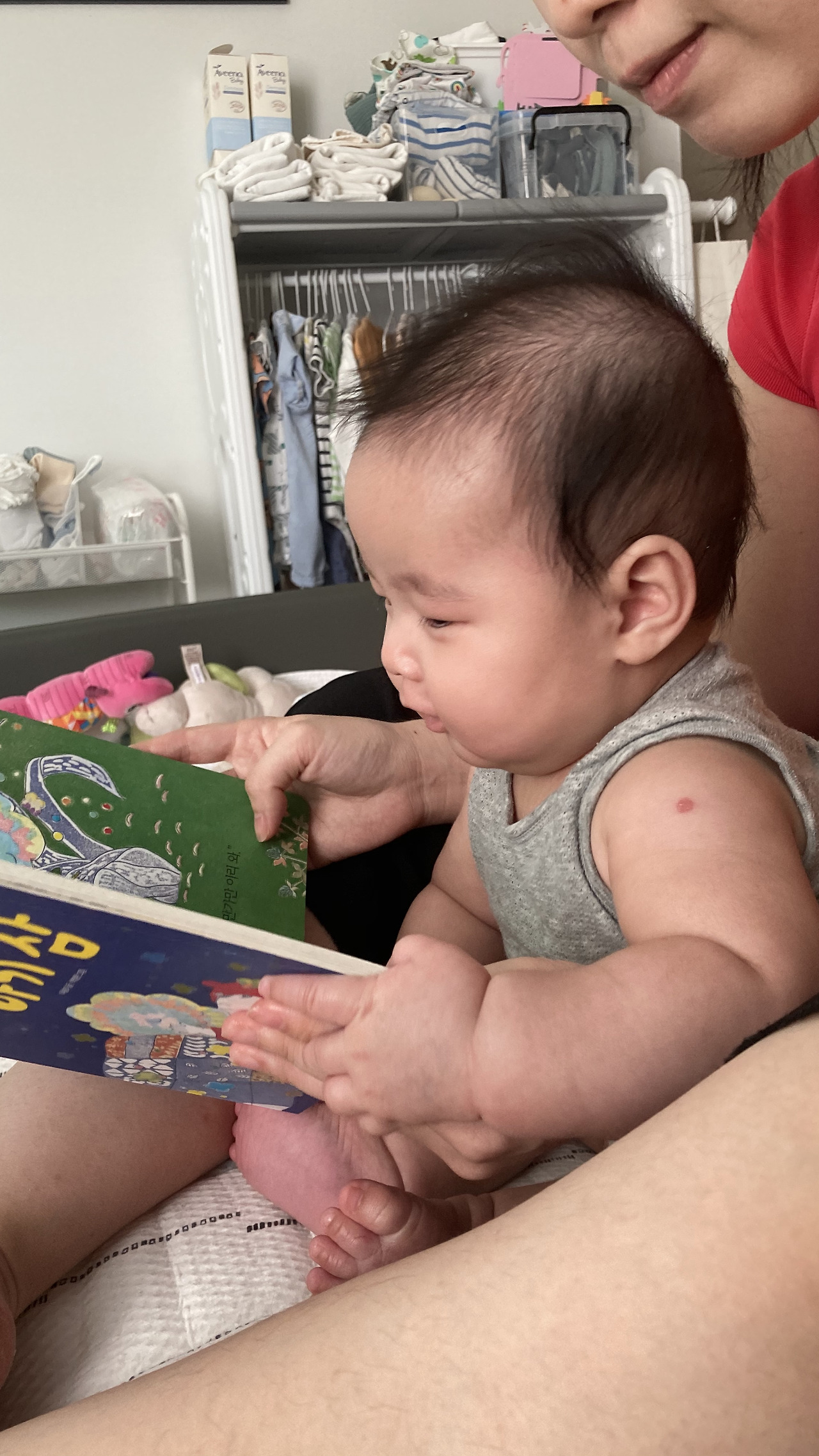 이 시기에 책을 보여주기는 했지만 역시 내가 읽어주는 장면은 아무도 찍어서 남겨주지 않기 때문에 아빠가 책을 읽어주는 영상만 남아있다.(조금 억울하다...) 나중에 아빠만 많이 읽어줬다고 기억하진 않겠지..?