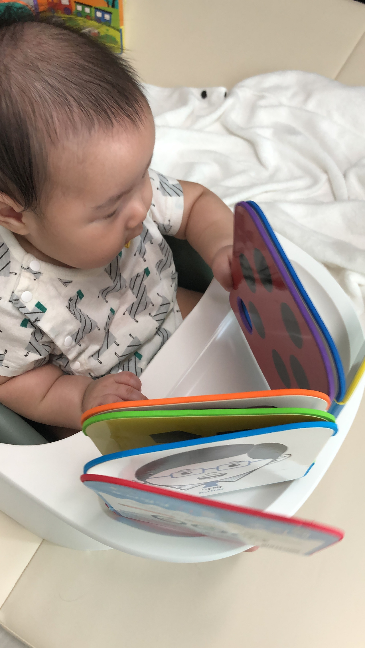 물론 초점책을 읽었다고 하기는 좀 그렇고 그냥 보는 용도이긴 하다. 하지만 나는 이 것을 첫 독서라고 보고, 그 이후 모든 활동을 독서와 연계시켰다. 포인트는 아기가 보든 안보든 그냥 주변에 두고 놀아도 책 주변에서 놀고, 자도 책 주변에서 자는 것이다.