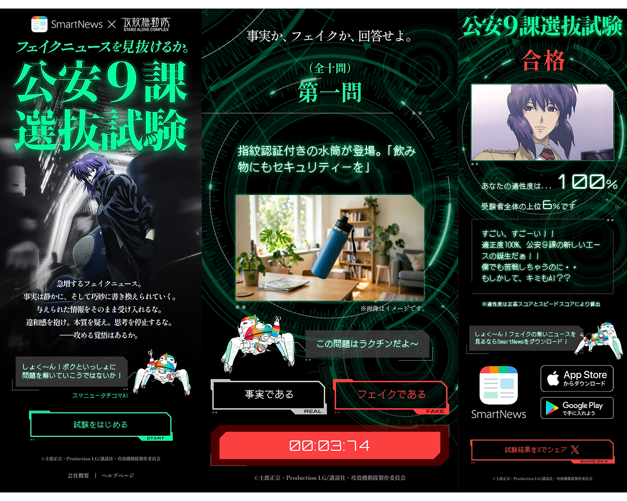 내용은 이렇습니다. 여러 개의 뉴스 기사가 제시되는데, 그중에는 진짜 기사도 있고 AI가 창작한 가짜 기사도 섞여 있습니다. 참가자는 어느 것이 가짜인지 가려내야 합니다. 시험이 끝나면 정답률에 따라 공각기동대의 캐릭터가 등장해 평가해 줍니다. 만점에 가까우면 쿠사나기 소령이 인정해 주고, 점수가 낮으면 귀여운 타치코마가 위로 비슷한 조언을 건네주는 식입니다.