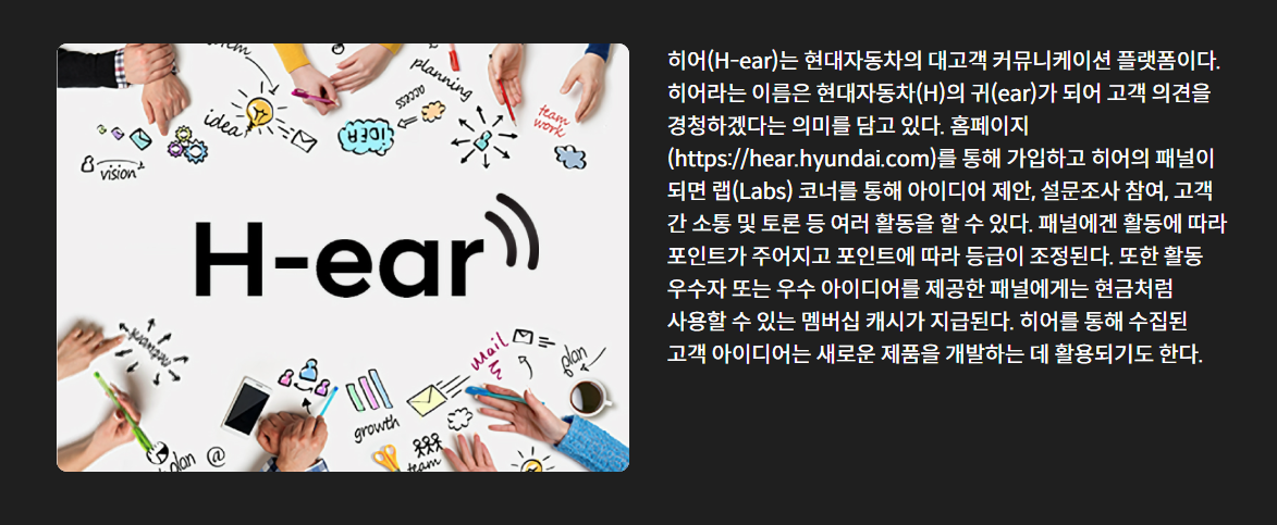 현대자동차그룹이 2019년 시작한 고객 소통 플랫폼 H-ear는 약 5년 만인 2024년 7월 1일 종료를 공지하며 정리 수순을 밟았습니다. “고객과 함께 미래차를 만든다”는 취지로 아이디어를 공모하고 패널을 운영했지만, 결국 공식 운영을 멈췄습니다.