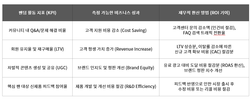 예를 들어 브랜드 팬덤 활동의 이점 중 '고객 충성도 및 유지 증가, 브랜드 평판 향상'은 '고객 지원 및 구매 비용 감소'로 재무적 환산이 가능합니다. 또한 팬들 간의 정보 교류 활동을 통해 절감된 고객 서비스 인력 비용을 팬덤 투자에 대한 수익으로 계산함으로써, 팬덤의 재무적 기여도를 명확히 입증할 수 있습니다.