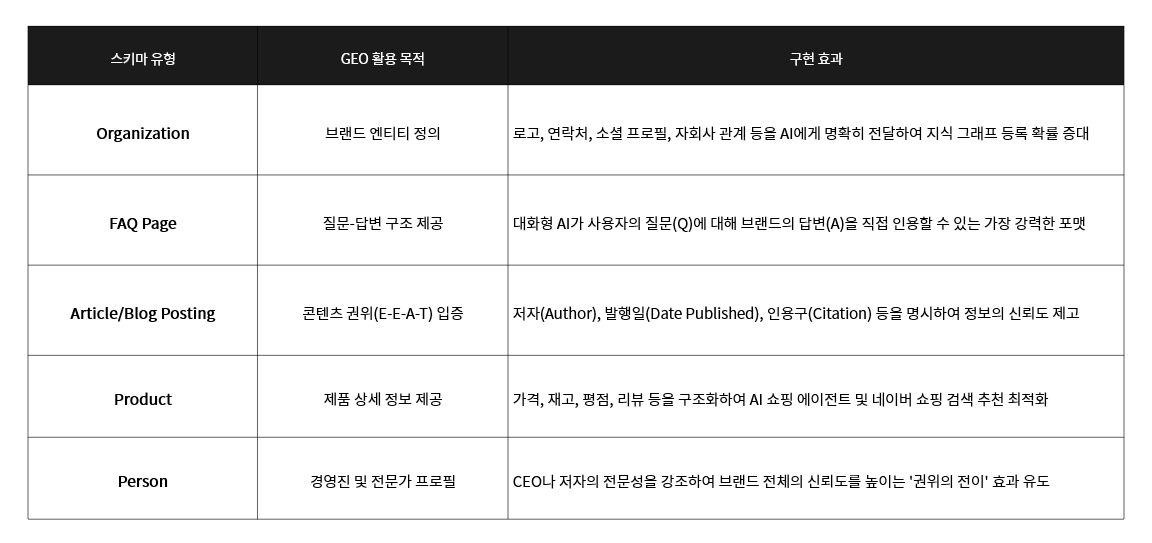스키마 마크업(Schema markup)은 스키마 마크업은 웹페이지의 내용을 검색 엔진이 이해할 수 있도록 구조화된 데이터로 표시하는 코드(JSON-LD 등)입니다. GEO에서 스키마 마크업은 선택이 아닌 필수입니다. AI는 방대한 텍스트 속에서 의미를 추론해야 하는데, 스키마 마크업은 "이것은 회사 이름이고, 이것은 제품 가격이며, 이것은 고객 리뷰다"라고 명확하게 정의해 주기 때문입니다.