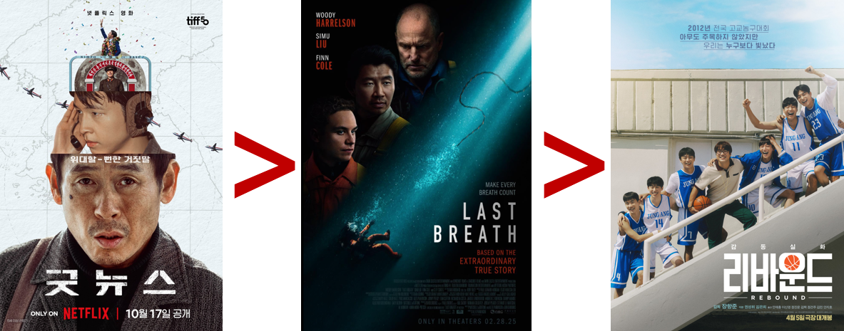 최근에 본 실화를 기반으로 한 영화들과 비교해 보자면, <라스트 브레스>는 이전에 소개해 드렸던 <굿뉴스>보다는 영화적 재미가 떨어집니다.