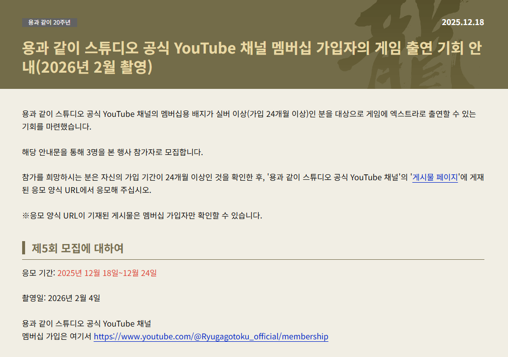 용과 같이 스튜디오 캠페인 참가 조건의 첫 줄은 “용과 같이 스튜디오 공식 YouTube 채널 회원 등급이 ‘실버’(24개월 이상 지속적으로 구독) 이상일 것”입니다.