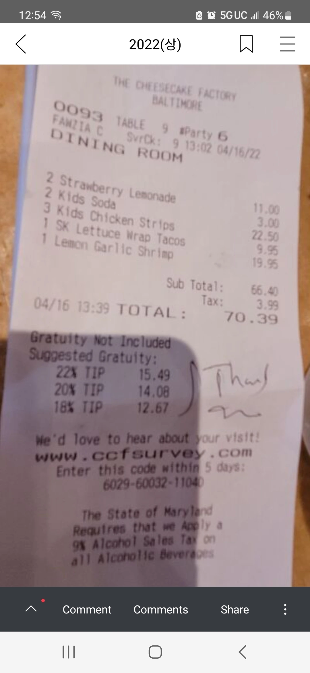지난 4월에 와서 먹었던 메뉴를 찾아냈다. 계산서를 찍어 두었기 때문에 귀챦아서 이거 그대로 똑같이 달라고 했다. 거기서 음료만 살짝 바꿔서 시켰더니 빨리 나오기는 했다. 8명이지만, 테이블을 2개로 나눠서 페이 한다고 알려줬는데, bill을 받아보니 메뉴가 이쪽과 저쪽이 막 섞여 있었다. 다시 알려주고 고쳐온다고 했다. 여기서는 배 터지게 먹어도 40-70불이면 족하다. 그래서 내가 자주 온다. 특히 여기서 주는 빵이 너무 맛난다.