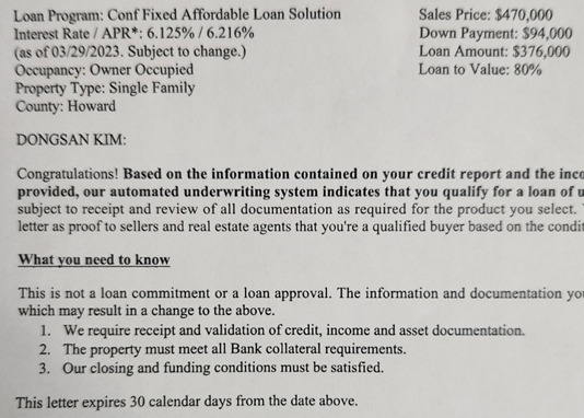 다운페이로 10,000불, 클로징 FEE로 7500불을 지원해 준다는 것이다. 이미 다른 론매니저와 Pre approval letter(이 서류는 얼마짜리 집을 사려는데 얼마의 이자로 얼마가 대출가능하다는 은행의 서류이다)를 만들었는데, 은행에서 또다시 만들어줬다. 두 곳을 잘 비교해보고 결정해야겠다.