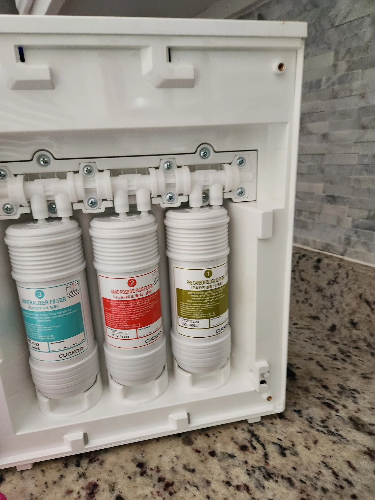 정수기 필터는 3개의 종류가 있는데, 교체 시기 때마다 택배가 오더니, 지난번에는 한꺼번에 일 년 치 필터가 배달되었다. 교체일을 적어두기는 했는데 벌써 3월 2일이 지난 지 한참 되었다. 주말에 하려고 일정표에 적어두었는데, 드디어 실천에 옮겼다. 순서는 간단한다. 1. 물을 잠근다. 2. 옆면 뚜껑을 연다. 3. 교체대상 필터를 뽑는다. 4. 새로 넣는다. 5. 뚜껑을 닫는다. 6. 물을 10회 정도 뽑아준다. 이번에는 아래의 3종 필터 중에 우측에 겨자색 필터 한 개만 갈면 된다. 셀프로 교체하면서 한 달에 내는 렌탈비는 19.07불이다. 교체할 필터에 대한 가격이라 생각하면 될 것 같다.