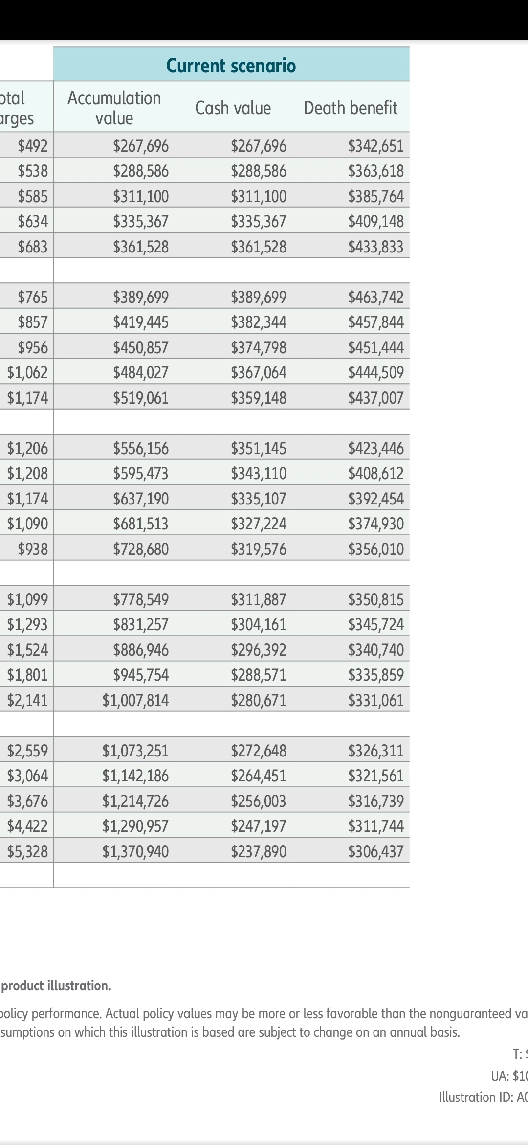 위 그림의 우측은 61세부터 사망보험금액이 적혀있다. 이것이 계속증가한다.처음에는 100000불이였으나 cash vale의 이자가 계속불어서 사망보험금에 더해지는것이다.참고하시길