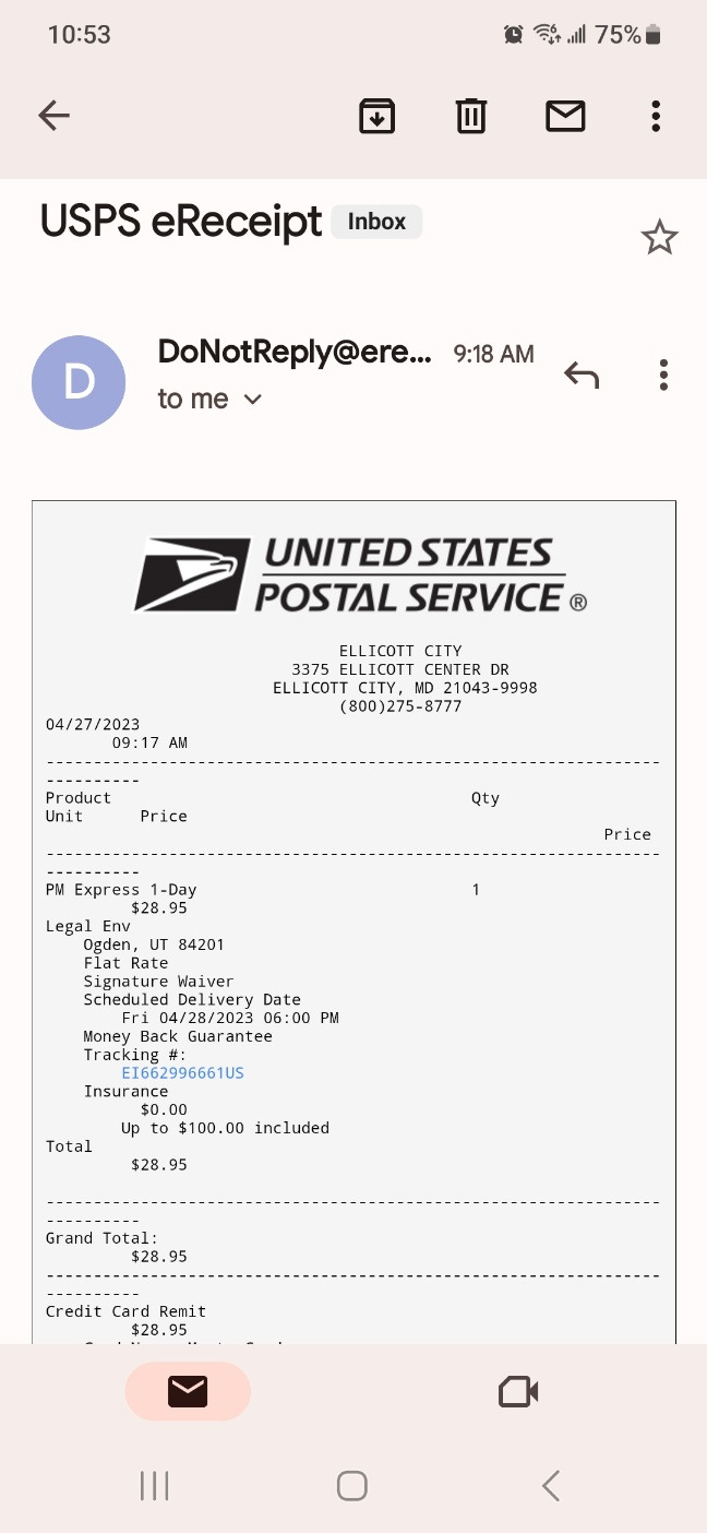 영수증은 프린트할 건지, 이메일로 받을 건지, 둘 다 받을 건지 물어본다. 자료를 남기기 위하여 둘 다 받는다고 선택하고, 이메일주소를 기입했다. 이메일에 TRACKING 번호가 있어서 그것만 클릭하면 금방 도착여부를 알 수 있다. 다음부터는 이 방법으로 영수증을 받아야겠다. IRS에 보내는 중요한 서류라서 빨리 가고 잘 도착하도록 신경 써야 하는데, 무사도착하기를 기원해야겠다.