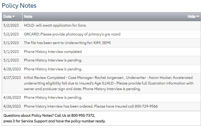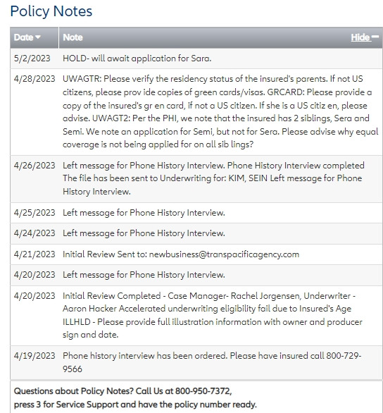 큰딸, 셋째 딸은 4월에 application을 마쳤고, 5월 3일 아침 둘째 딸의 application을 마지막으로 작성했다. 큰딸의 policy note를 보면, 5월 2일 자로 sibling인 Sara의 applicaion을 기다린다는 마지막 note가 있었다. 여기에서 모든 자녀는 같은 보험을 같은 커버리지로 들어줘야 한다는 것을 알 수 있다. 둘째 아이는 왜 아직 신청을 안 했는가? 나는 현재 2개의 illustration을 놓고 비교하는 중이다. 6월 30일 생일이 되기 전에 application을 작성할 것이라고 디펜스를 했더니, 보험사에서 그 application을 기다린다는 것이다.