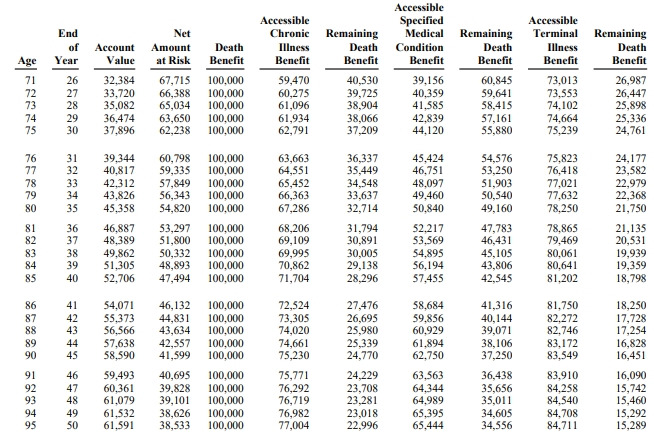 한국말로 하면 특약이다. 보장되는 기본 보장내역이 아닌 내가 추가하고 싶은 라이더를 더 붙이면서 보험료를 조금 더 낸다. 가령 ACCELERETED BENEFIT이 있는데 의사가 생존확률이 1년 미만이라고 판정해 주면 살아있는 동안 액면가의 60 혹은 90%(보험사마다 규정이 다름)를 미리 받고 남은 금액은 사망 후 수혜자에게 돌아간다. 이외에다 다양한 RIDER가 있다. ACCELERETED BENEFIT라이더는 ALIIANZ나 콜럼버스라이프처럼 기본적으로 포함되기도 하고 따로 들어야 하는 경우도 있다. 이 외에도 LONGTERM CARE RIDE난 SPOUSE RIDE 등 다양한다. ACCIDENT RIDER:사고로 인한 사망은 보험료를 두 배 보상해 준다. 이런 것도 있다. 아래의 표에서 보면 terminal illness benefit은 암과 같은 질병을 말한다. 100k액면가를 갖는 보험이고. 71세어 암이 걸리면 73013을 미리 주고 사망하면 26987을 준다는것이다.