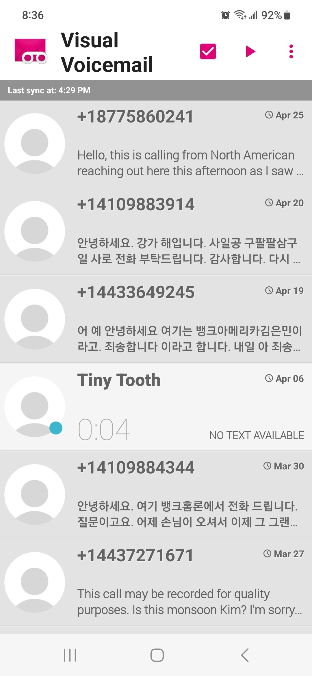 VISUAL VOICE MAIL-아래의 이미지처럼, 누군가가 나에게 보이스메일을 남겼다면 그것을 그대로 옮겨서 한 번에 글로 볼 수 있게 해준다.