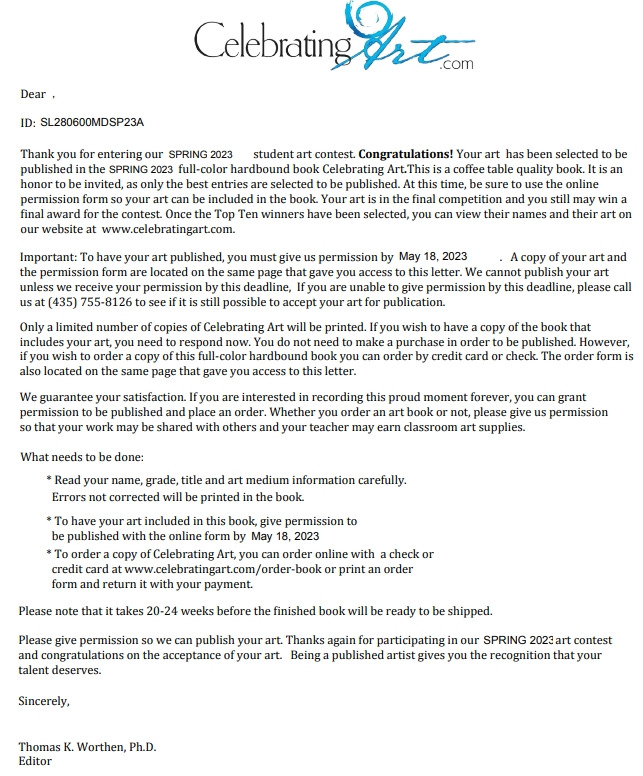 2022년 7월 5일, 그날을 기억하는 것은 한국의 미술학원 선생님 아들이 우리집에 섬머 캠프를 하려고 공항에 데리러 간 날이다. 픽업하고 바로 미술학원에 데려다준 첫 날이라서 안까먹는다. 미국학원에서도 소질이 있다고 하신다. 그러더니 연말에 작품을 하나 내면 좋을 것 같다고 해서 그러시라고 했다. 처음 나간 대회인데 high merit에 선정되었다는 것이다.