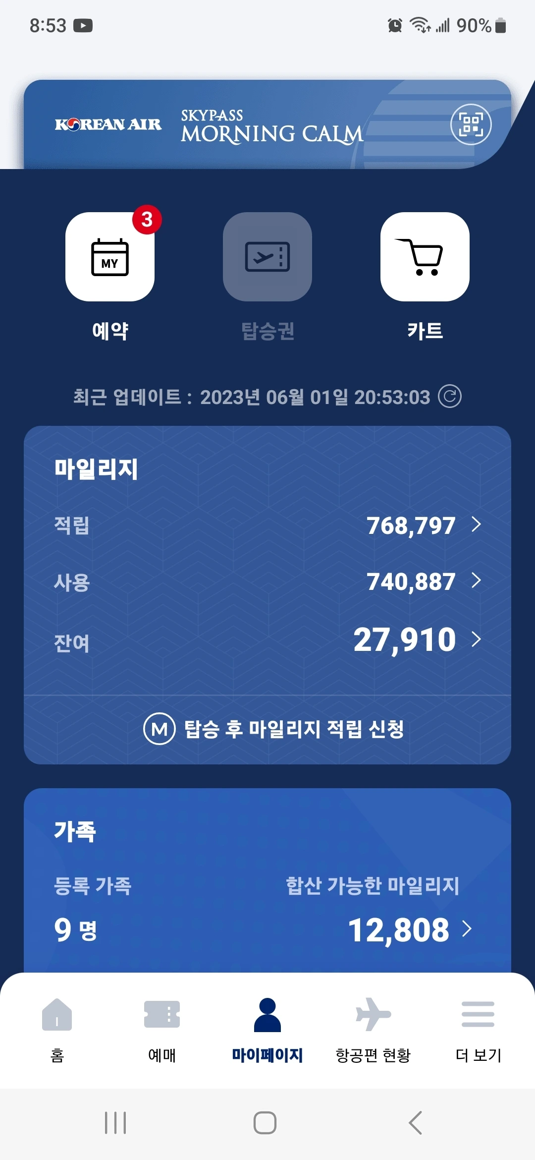 항공사 마일리지를 모아서 사용해 본 경험이 있는 사람들은 그 마일리지의 위력을 잘 알겄이다. 나 또한 대한항공을 포함한 스카이팀의 마일리지 적립을 오랜 기간 동안 열심히 모아서 잘 사용했다. 한국에서는 파란 롯데카드(그 카드가 지금은 신청불가)와 현대카드(대한항공카드)를 통하여 많이 모았다. 신용카드를 통해 적립한 점수가 700,000점이 넘어가니 장거리 왕복으로 10장 정도 받은 셈이다.