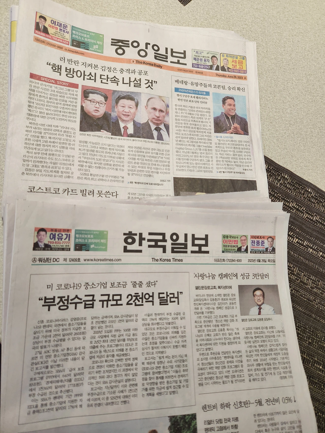내가 일주일에 3일 오전만 출근하는 곳이 있다. 별로 하는 일은 없지만 보수는 꽤 된다. 이곳에 중앙일보와 한국일보가 매일 배달된다.