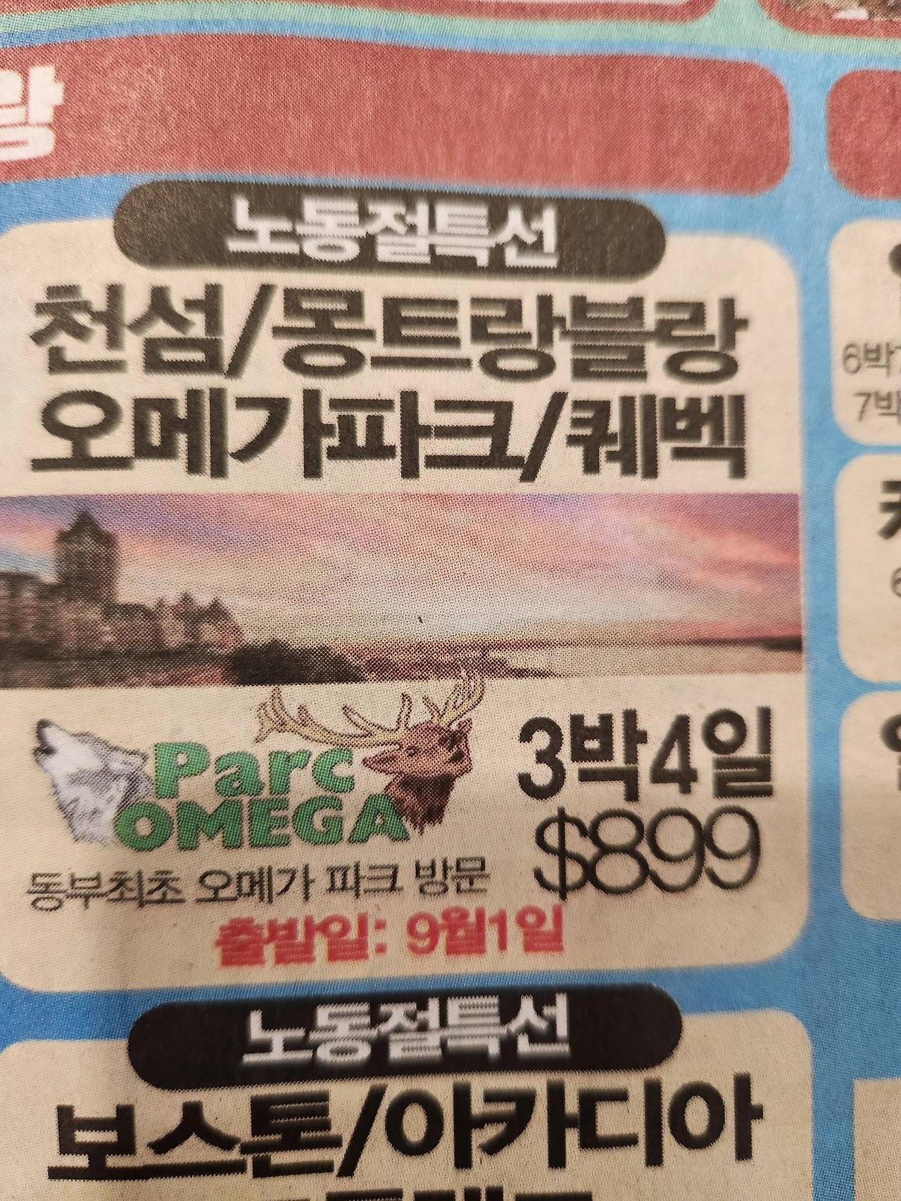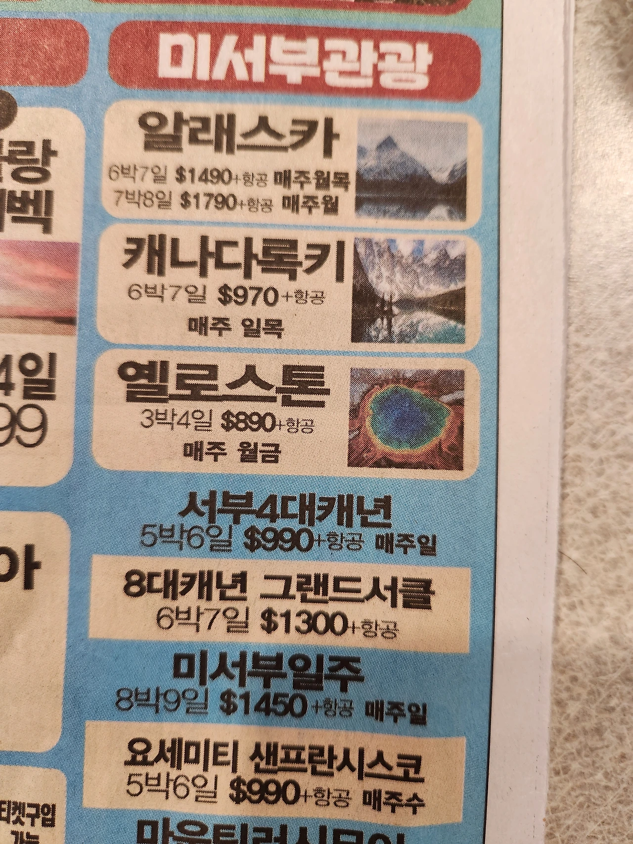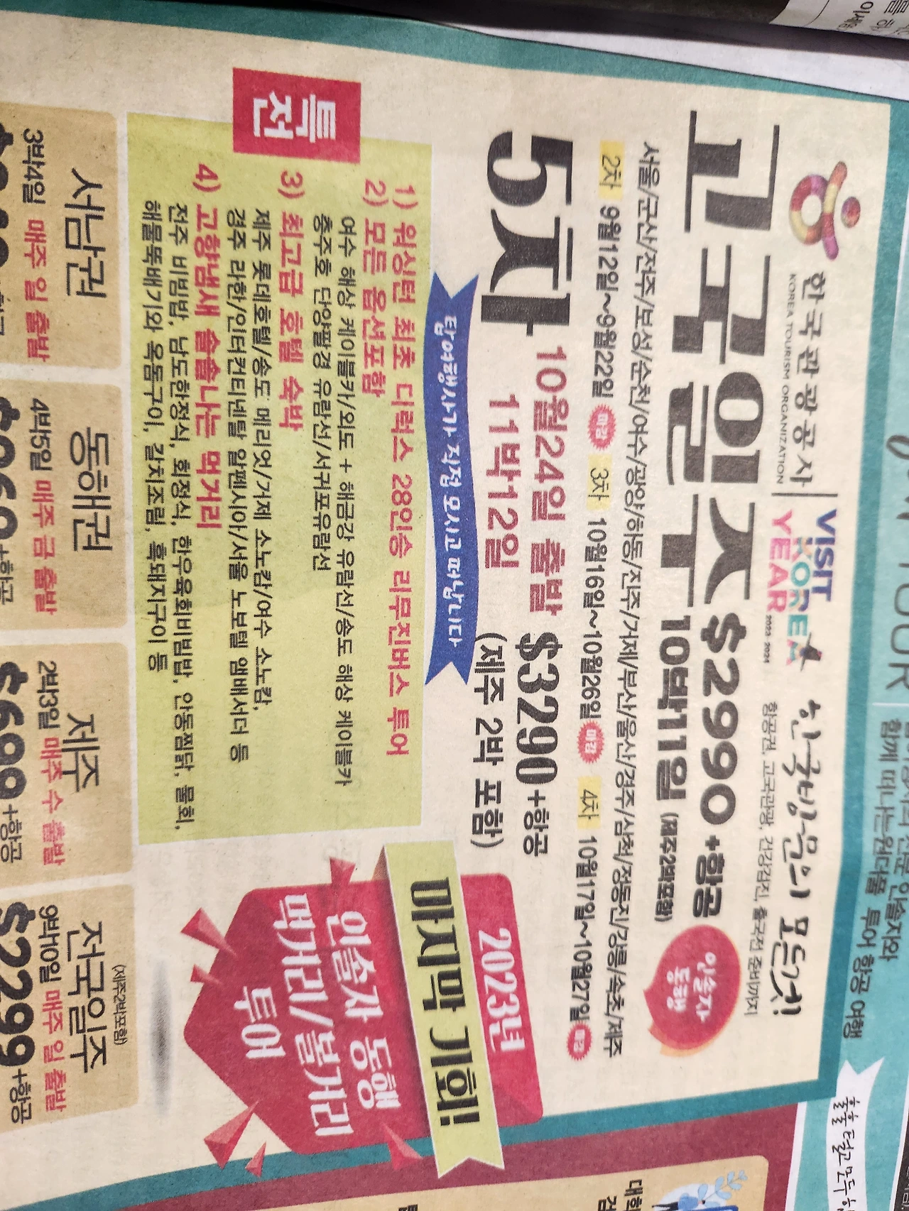 이 중에서 내가 좋아하는 섹션이 있다. 바로 여행사광고이다. 고국일주 11박 12일 3290불+항공.이라고 적혀있는 코스가 있다. 서울군산전주보성순천여수광양하동진주거제부산울산경주삼척정동진강릉 속조제주를 포함한다. 제주 2박을 빼고 9박인데 저 일정을 소화시키려면 보통 체력으로는 힘들어 보인다. 나 정도의 체력이면 모를까.