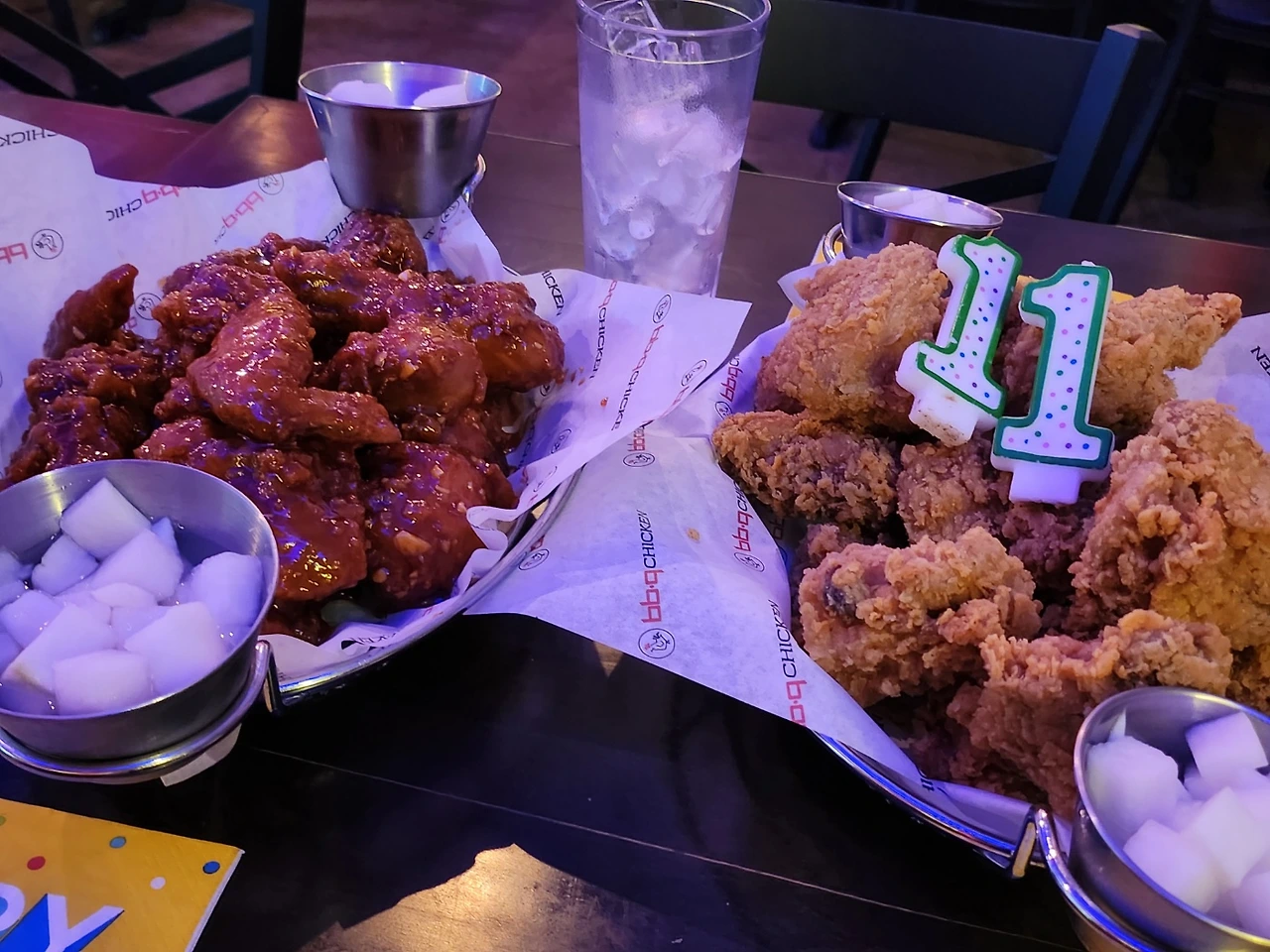 픽업해 주는 친구엄마에게 우리 집에 오기 직전 마트에 뭐 사러 가는척하며 BBQ치킨으로 오시라 했다. 큰딸이랑 치킨 두 마리를 시켜두고 이것저것 준비하며 기다렸다. 맛나게 먹고 이번생일도 무사히 지나갔다. 한국서는 학기 중에 생일인 아이들이 미국서는 방학, 반대로 겨울방학중인 2월 2일은 미국에서 학기 중에 속한다.