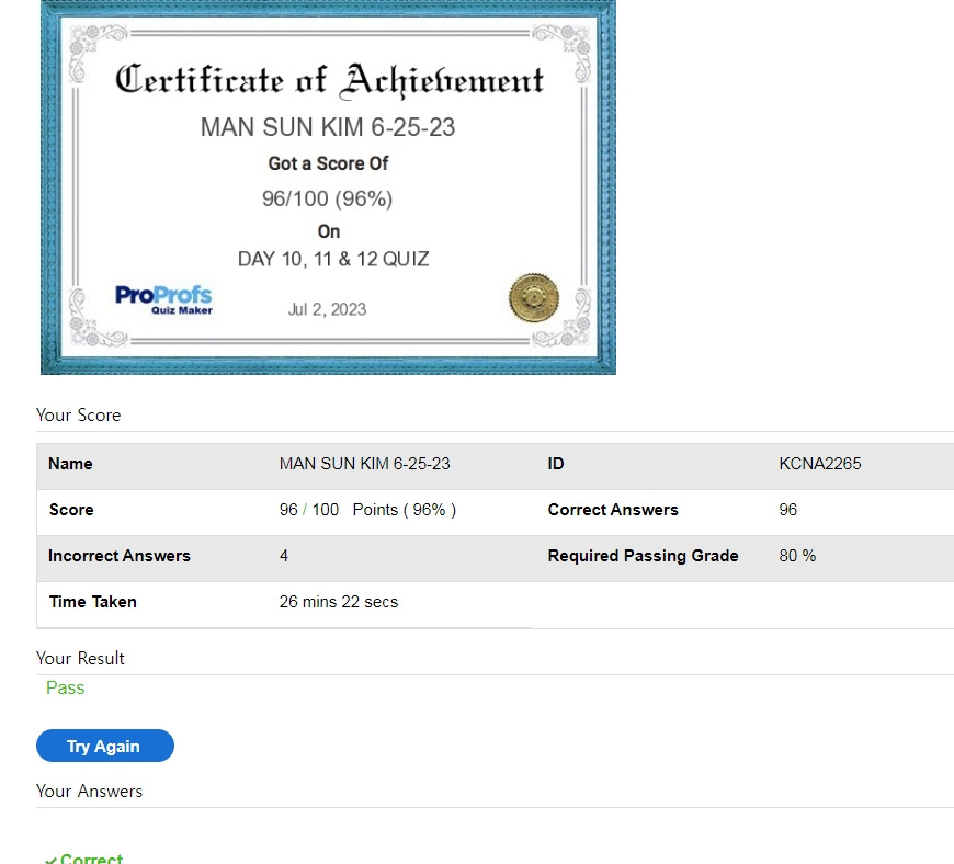 시험은 영어이지만, 메디컬 쪽에 관심이 많은 사람들은 용어가 익숙해서 접근이 쉬어 보인다. 전반적인 과정을 설명해 주기 위해서 내가 그냥 따보는 게 낫다고 생각되어서 시작하게 되었다. 3주의 온라인 교육을 마치고 1주의 실습을 한다고 한다. 나는 온라인 교육을 5일 만에 마쳤다. 강의를 듣고 퀴즈를 풀어야지 다음강의로 진도를 뺄 수 있다. 하다 보니 금방 끝냈다. 많은 분들에게 빨리 알려줘야겠다.