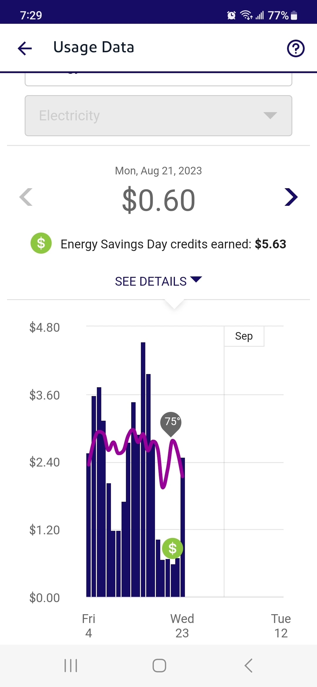 우리가 캐나다 여행 중에 한 날이 에너지세이빙데이였나 보다. 여행 중에는 1일 평균 0.07달러로 찍혔네. 아마도 돌아가는 냉장고와 현관신발장 앞 등을 켜두고 간 금액이 그 정도 인가보다.