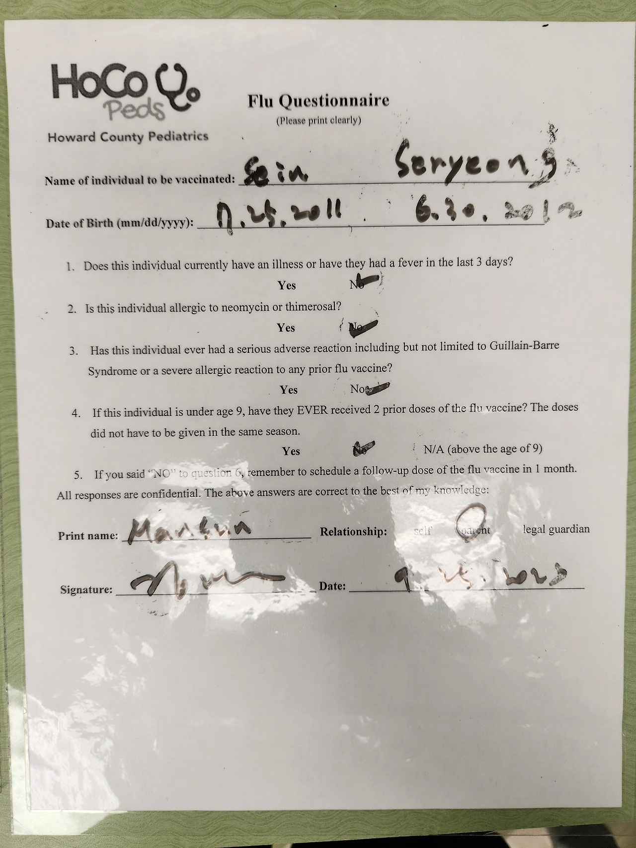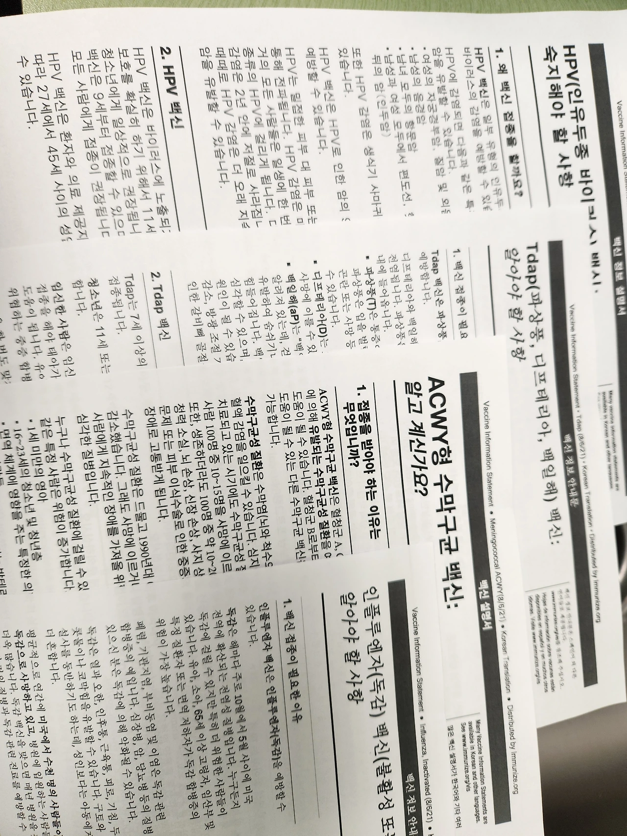 만11세 되는 어린이는 hpv,T dap mcv,flu. 양쪽팔에 2대씩 맞았고.만12세 되는 어린이는 flu만 접종했다. Hpv 2차는 올해 5월에 했단다. 난 기억이 안나지만.하하하