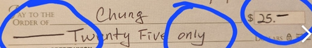 아래와 같이 영문으로 쓰는란의 앞쪽에 줄을 쳐야 한다. 그리고 숫자로 적는 부분에 소수점 이하에 뭔가가 없다면 여기도 줄을 쳐야 한다는 것이다. 누가 받아서 25를 125로 둔갑시킬 수 있으며, one hundred를 적을 수도 있기 때문에 미연에 방지해야 한다는 것이다.