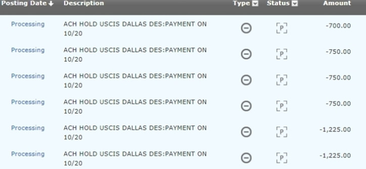 접수가 되었으니, 이민국에서는 접수비를 출금해간다. 그 뒤로 개인 체크로 보낸 것들이 통장에서 인출되기 시작했다. 아래의 비용은 변호사님에게 체크로 써서 보내야 한다. 2년 전, 지인이 알려준 비용에 비하면 많이 오른 가격이지만, 앞으로도 꾸준히 오를 것으로 예상한다.