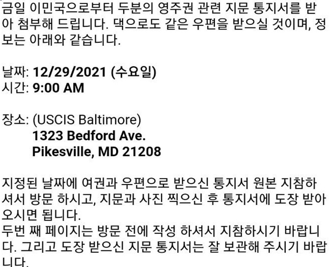 접수 번호를 받고 나서 두 달 정도 지난 후에, 아래와 같이 지문 통지서는 시간과 장소가 정해져서 집으로 통보가 된다. 왜 우리 둘만 가지? 아이들은 어려서 지문을 안 찍나? 우리가 연말에 멀리 여행을 갔으면 어쩔 뻔? 그냥 오라니까 가보자... 이런 마음으로 USCIS의 사무실로 갔다. 이곳은 우리 집에서 13마일 정도 떨어진 곳으로 철저한 예약 시스템이라서 그런지, 사무실 크기에 비하여 이용하는 사람의 수가 매우 적었다. 우리가 가는 시간대에는 딱 우리만 들어간 것 같았다. 이날 갖고 간 서류를 제출하면 직인을 찍어서 돌려주는데 이것을 잘 간직해야 한다. 나중에 영주권을 받고 보니 내가 제출한 사진으로 나온 것이 아니라 여기서 찍어준 사진으로 발급이 되었다. 운전면허증도 그렇고 미국은 포샵을 인정하지 않는 것 같다.