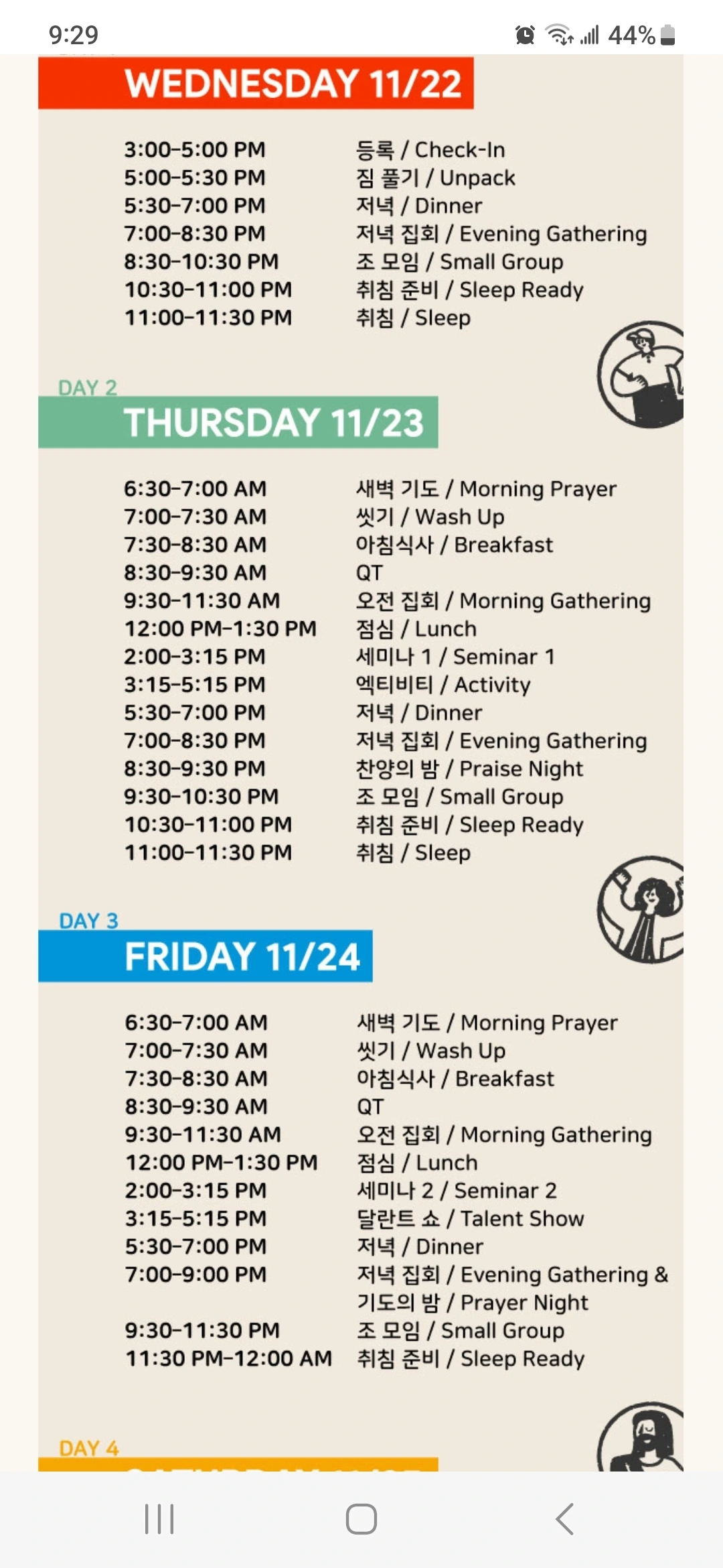 출발 전에 이메일 공지를 받고 어떤 조에 편성되었는지 조교님이 누구인지는 간단히 알 수 있다. 차가 많이 밀릴 것 같아서 10시에 교회에서 집결하고 교회밴을 타고 간다. 도착 직전에 점심을 사 먹고. 캠프장으로 입실