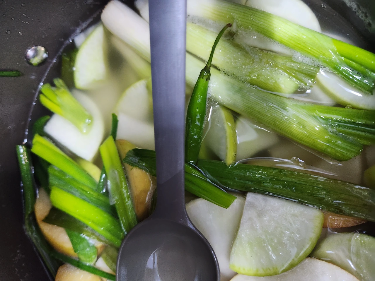 채칼로 썰어둔 무를 소금을 치고 십분정도 둔다. 이제 냄비에 넣고 인덕션위에 올린다. 알아서 익는다.