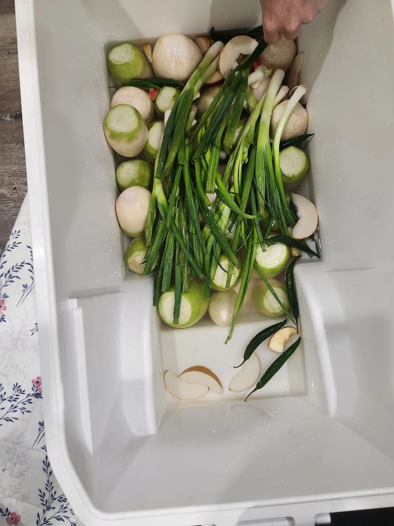 2.동치미는 남편이 2일간. 무에 소금을 바르고 숙성시켜놨다. 배,사과,파 등을 썰어넣고 다시마 쌂은 물을 넣고 암튼 동영상보고 잘 만들었다. 너무 맛나서 여기저기 좀 나눠줬다. 통 무를 익히려면 오래걸리니 몇개만 꺼내서 잘라놓으면 몇일뒤에 먹을 수 있다고 한다.