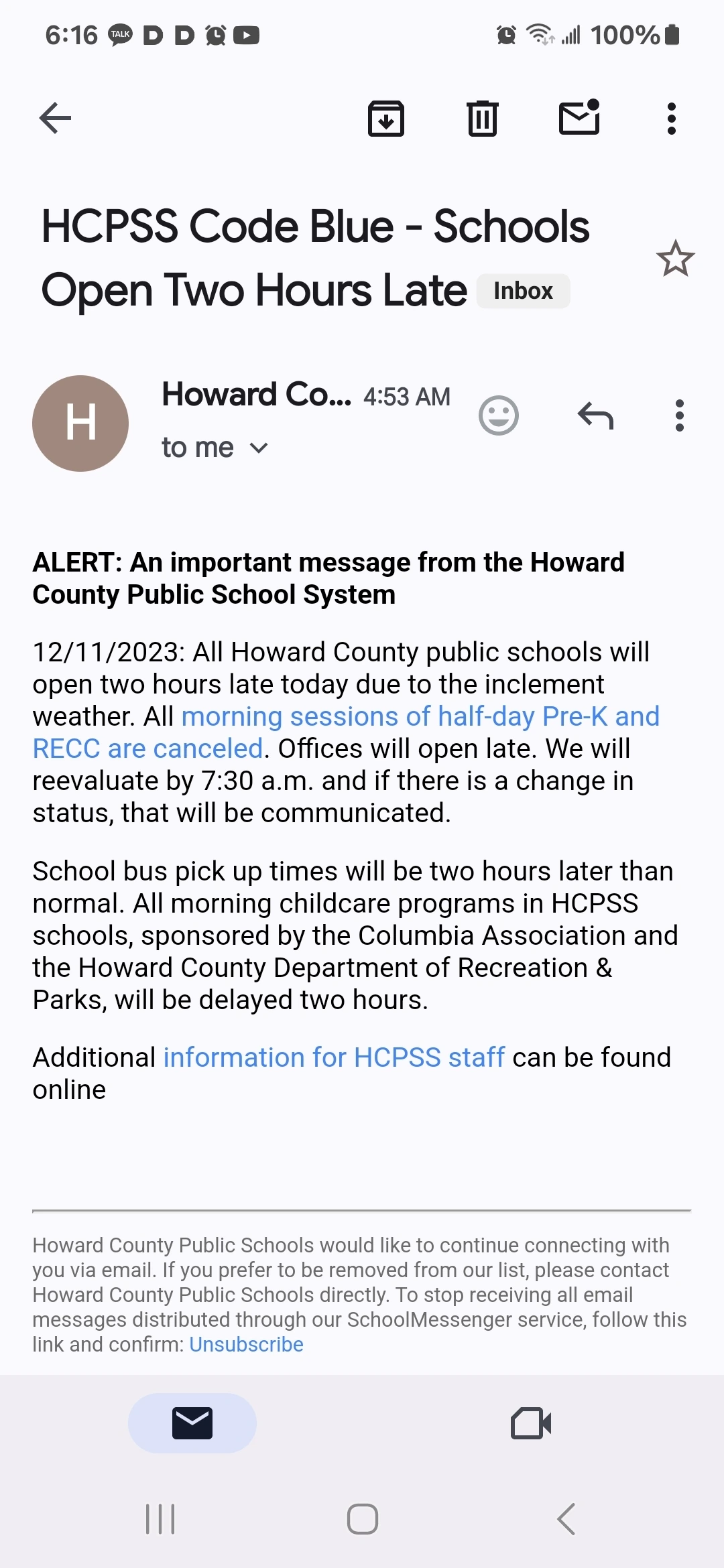 찍 눈을 뜨면 폰을 먼저 본다. 이메일박스에 반가운 이메일이 왔다. 기상악화로 인하여 2시간 늦게 수업이 시작된다고 한다. 7시 15분에 나가는 아이들은 9시 15분에 나가면 버스를 타고, 8시 50분에 나가는 아이는 10시 50분에 나가면 스쿨버스를 탄다.