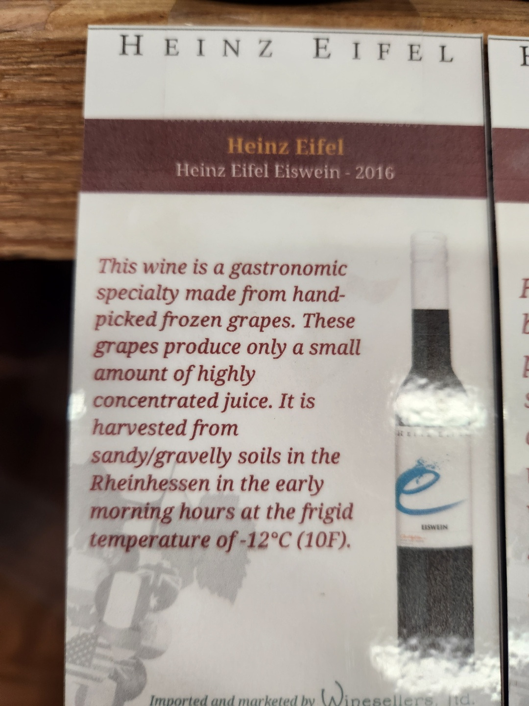 우리 동네 리쿼 샵에서 35불짜리 아이스와인을 발견했다. 라벨에는 다음과 같이 쓰여있었다. 이 와인은 얼린 포도를 따서 만든 와인이다. 이 포도는 아주 적은 양의 고농축 주스만을 생산한다. 이것은 영하 12도에서 수확했다.라고 적혀있었다. 영하 12도에 포도 따시느라 고생하신 분들에게 감사해야겠다.