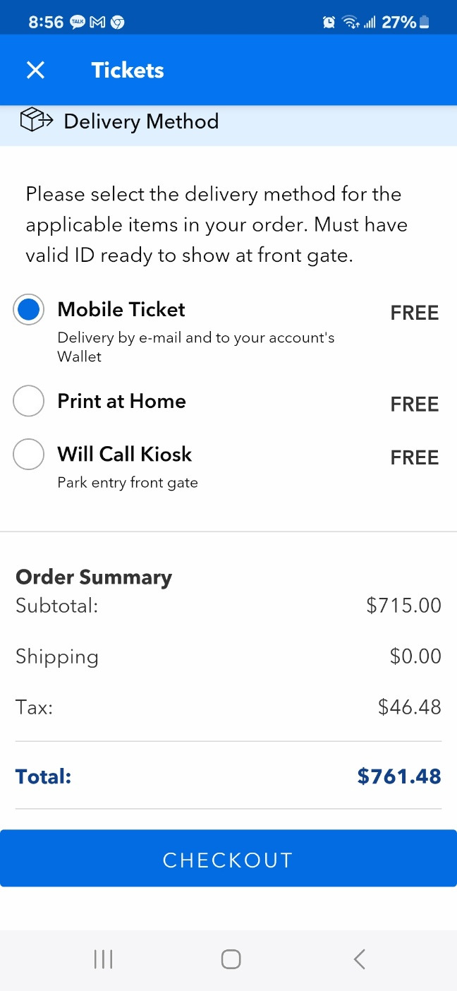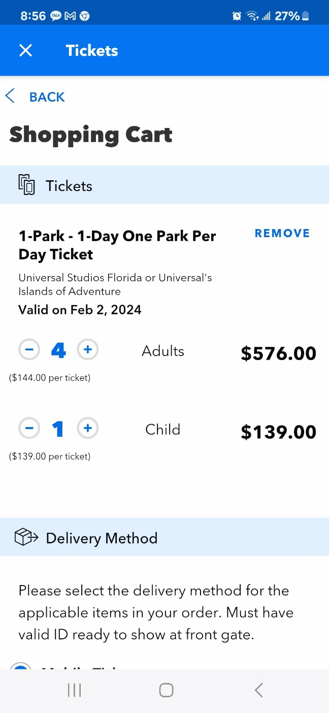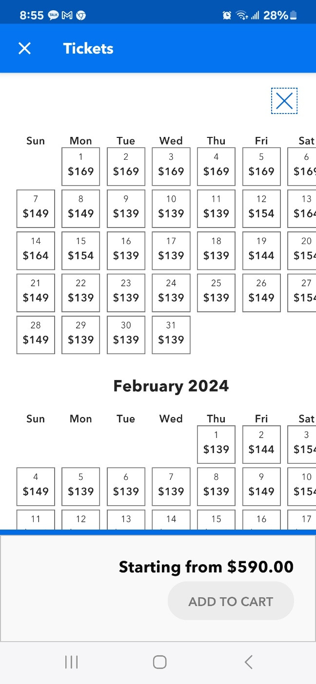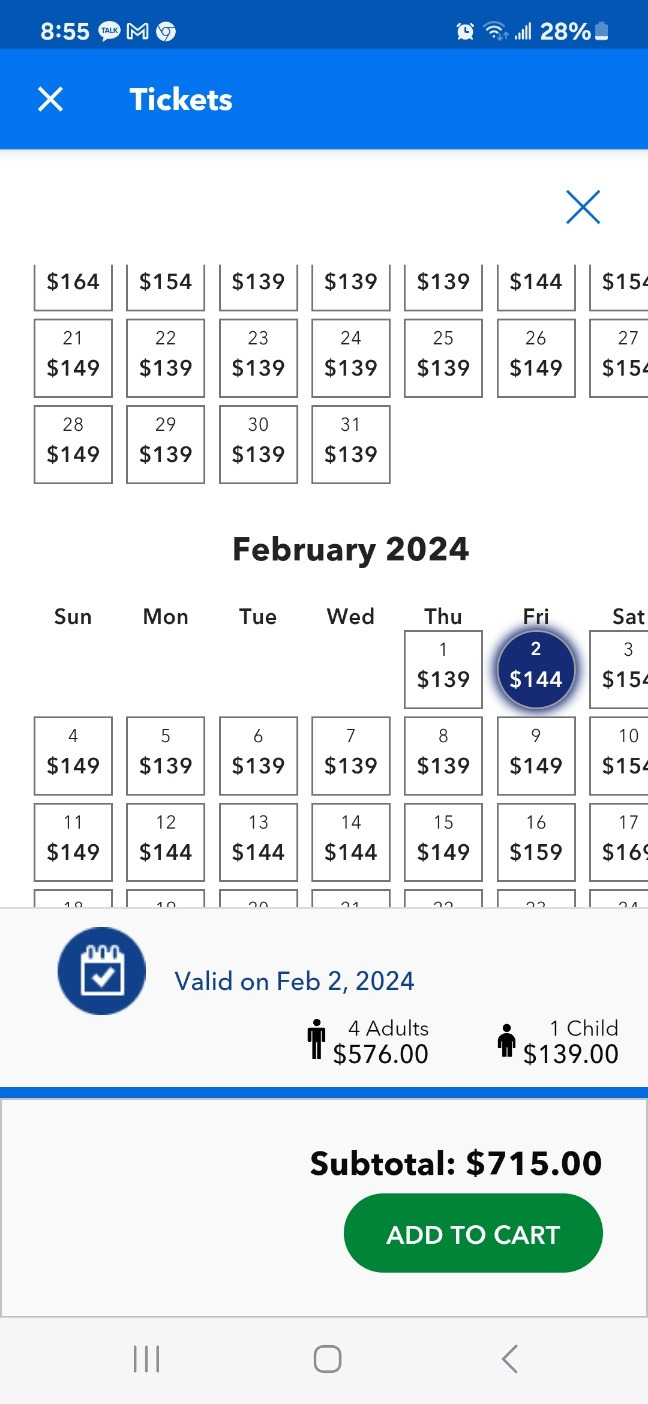이게 가장 큰돈이 들어간다. 만 10세부터 성인으로 들어가서 우리 집은 성인 4, 소아 1명 <3-9 age>으로 표를 산다. 소아라고 해도 5달러 싸다. 요금이 입장하는 날마다 다르다. 아래 표를 보면 139-169불까지 다양하다. 우리가 가는 날은 144불 정도이다. 아이는 139달러이고 성인은 144불이고. 총 715불이다. (여기에 택스가 46.48불 들어가서 총지불은 761.48이다. ) 어떤 카드로 결제를 할까 하다가. 1월 1일에 승인 나면 2월 15일에 돈을 갚으면 되니, 여신기간이 길어서 한국카드로 긁었다.