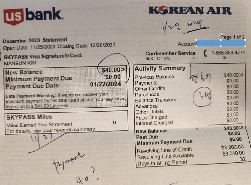 오늘 우편물이 7개 정도 날아왔다. 그중에 이 카드의 밸런스가 40달러가 있는는 것이다. 40을 갚으라는라는 것인가? 더 들어갔다는 것인가? 헷갈려서 고객센터에 전화를 했다.