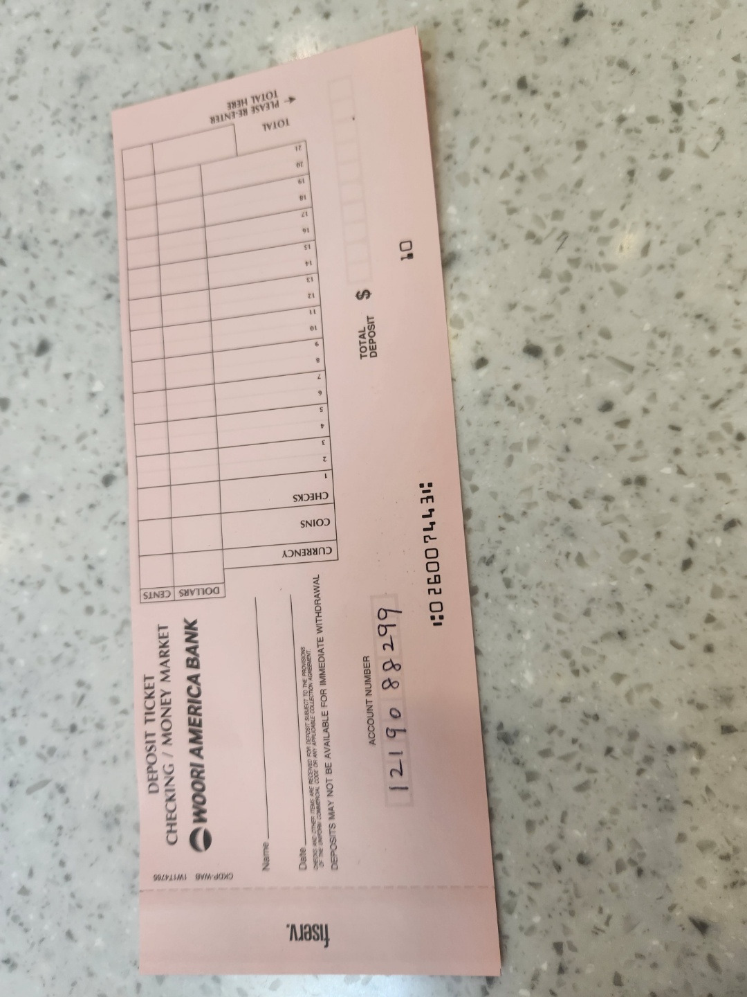 CASH를 넣으면 좀 번거롭다고 한다. 하얀 용지(아래 오른쪽)에 나의이름, SSN번호, 핸드폰 번호, 직업(occupation)을 적어서 내야 한다. 핑크색종이에는(아래 왼쪽) 오늘 날짜와 입금하는 금액을 써야 한다. 입금이 완료되면 영수증을 한 장 준다. CASH IN 1,000.00 이렇게 적혀있다(직원이 적어준것임. 소수 둘째짜리까지 기입한다. .00으로). 추가로 비용은 들지 않았다.