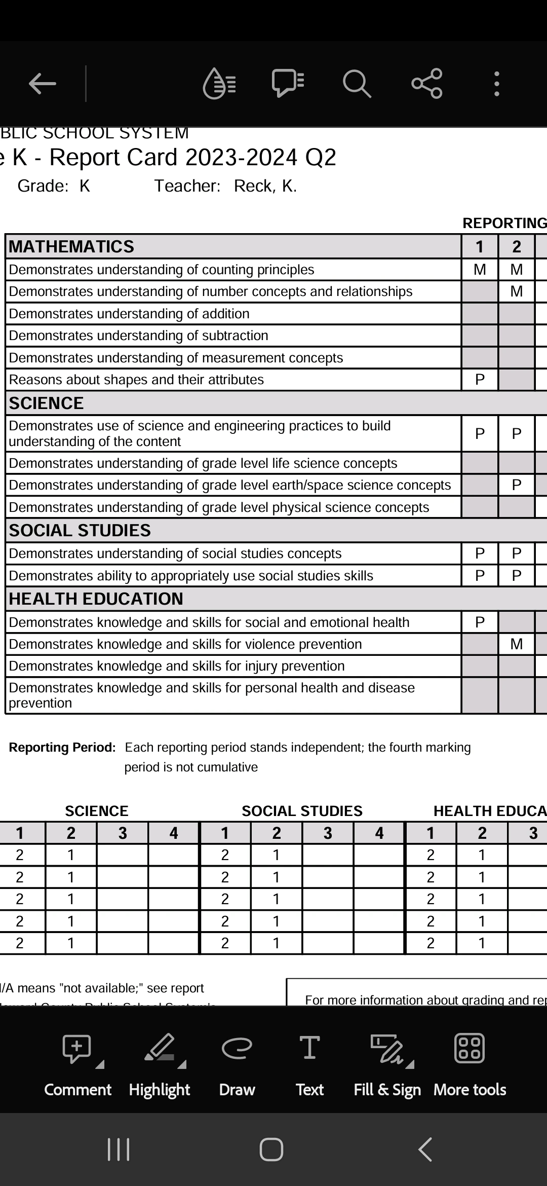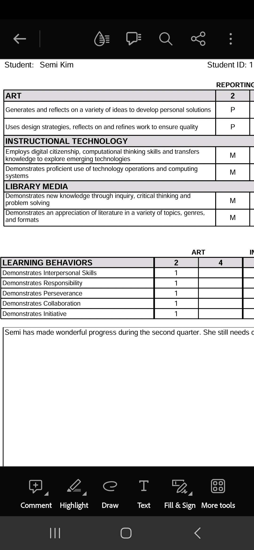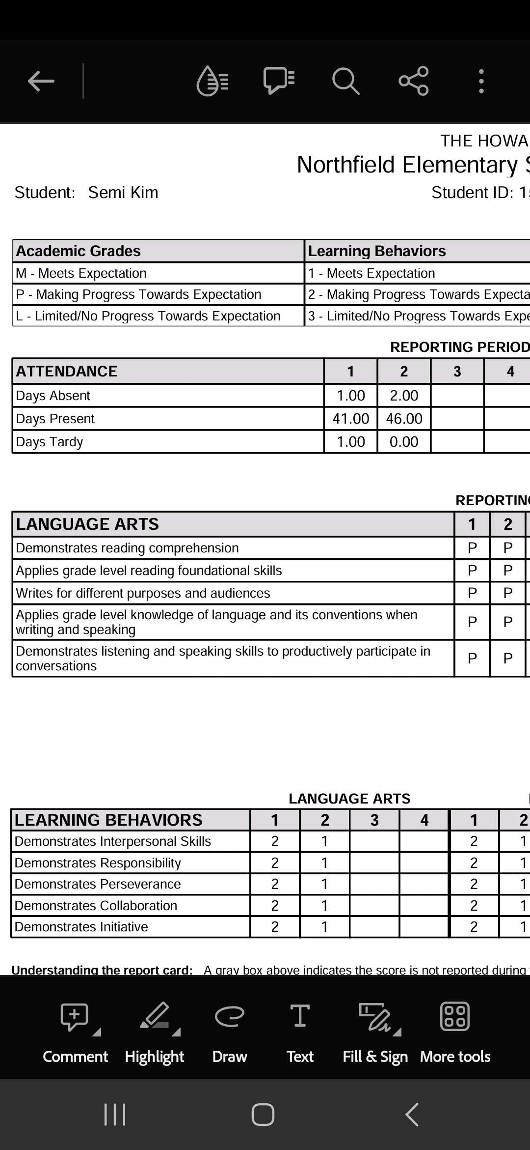미국서는 성적표를 report card라고 한다. 한국은 1학기와 2학기 두 번 성적표가 나오지만, 미국은 1,2,3,4 쿼터제로 4번의 성적표가 나온다. 이제 막 3 쿼터를 시작했고 지난 2 쿼터의 성적표가 해당 교육청 사이트에 가면 열람이 가능하다. 두 번보다는 네 번이 아이들에게 더 잔소리를 할 수 있으니 엄마 입장에서는 할 말이 많아진다. 이게 미국 교육의 장점인지는 모르겠다.