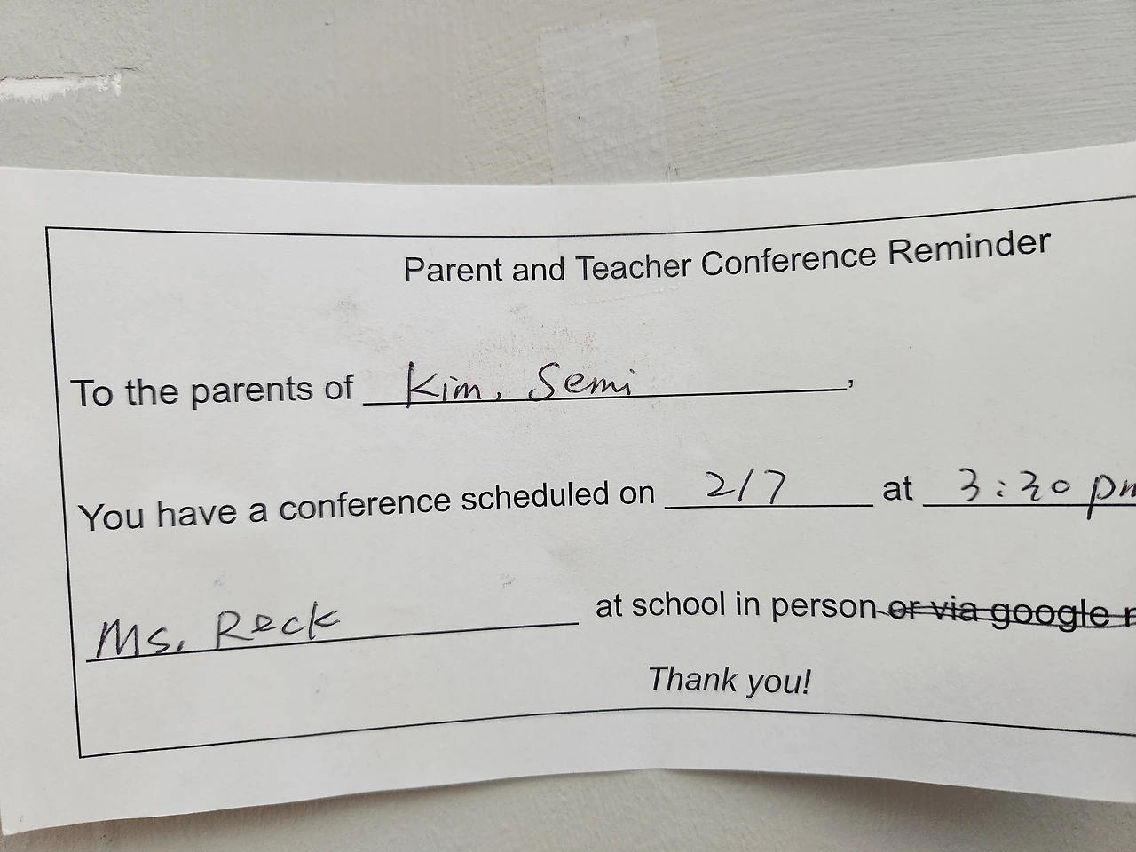 학교초에도 k학년의 상담이 있었는데 바쁜 이유로 참석을 안 한 것 같다. 가서 할 말이 뻔하기 때문에 좀 시간이 지나서 상담을 하는 게 좋겠다 싶었는데 드디어 스케줄이 잡히고 통보를 받았다. 마침 수요일 오후라 그날 재택근무하는 남편이랑 같이 갔다. 이런 날 아이들은 3시간 이른 하교를 한다. 집에 봐줄 사람이 있는 집은 아이를 두고 오지만, 둘째 레슨시간이 연달아 있어서 다 데리고 학교에갔다.
