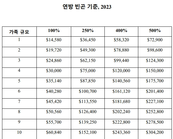 썸머수학 코스가 있는데, 이것은 미국 연방 빈곤지수 300% 안에 들어야 가능한 것인가? 여기서 미국연방빈공지수란 세대인원수별 규정된 인컴이 있는데, 본인의 실제 인컴/아래 표에 규정된 인컴을 계산하여 100%, 200%, 300% 이렇게 숫자로 표현하는 것 같다. 우리집이 100,000 을 번다면 나누기35140 하면 284%정도가 된다는 것이다.