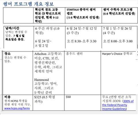 6학년, 7학년 학생의 경우, 딱히 할 것은 없고, 교육청 코스 중에 중국어 3주 코스가 50불에 개설된다고 한다. 독립기념일을 제외하고14일을 나가야 하는데, 신청했다가 취소했다. 왜 엄마 맘대로 신청하냐고 난리가 났다. 7월 2일에 3박 4일 교회 캠프를 떠나는데 시간이 겹친다는 것이다. 또한,8월 초에 도미니카 공화국으로 단기선교를 떠날지도 모른다. 스패니쉬를 잘 하는 큰애는 당연히 안한다고 할것같다.