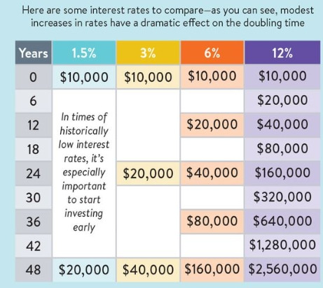 What is the Rule of 72 in simple terms? Do you know the Rule of 72? It's an easy way to calculate just how long it's going to take for your money to double. Just take the number 72 and divide it by the interest rate you hope to earn. That number gives you the approximate number of years it will take for your investment to double.