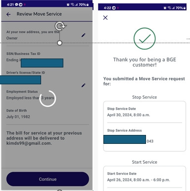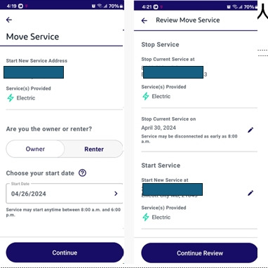 이제 STOP 할 주소와 START 할 주소를 적으면 된다. 여기에서 주인이나 세입자냐를 클릭해야 한다. 시작하는 날은 우리가 CLOSING을 하기로 한 날로 정했다. 그날부터 키를 받고 우리가 주인이 되는 것이다. 그리고. 지금 사는 집은 4.30일 날 마지막 날로 정했기 때문에 이렇게 신청해 놨다. 이삿날인데 아침 8시에 전기가 정지되면 차질이 없을지...... 걱정이네... 시간지정하는 것은 없었고, 저렇게 자동으로 나왔다.
