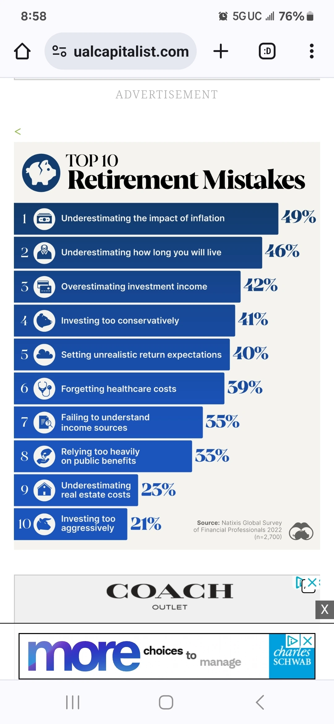 여기에서 1번은 인플레이션을 크게 고려하지 않았다는 것이다. 가장 많은 전문가들이 공통으로 뽑았다는 항목이다. 지금의 10만 불과 30년 뒤의 10만 불의 가치는 큰 차이가 있기 마련이다. 이런 부분을 생각하여 은퇴 후 필요한 경비산정을 다소 높게 감안해야 한다는 것이다.