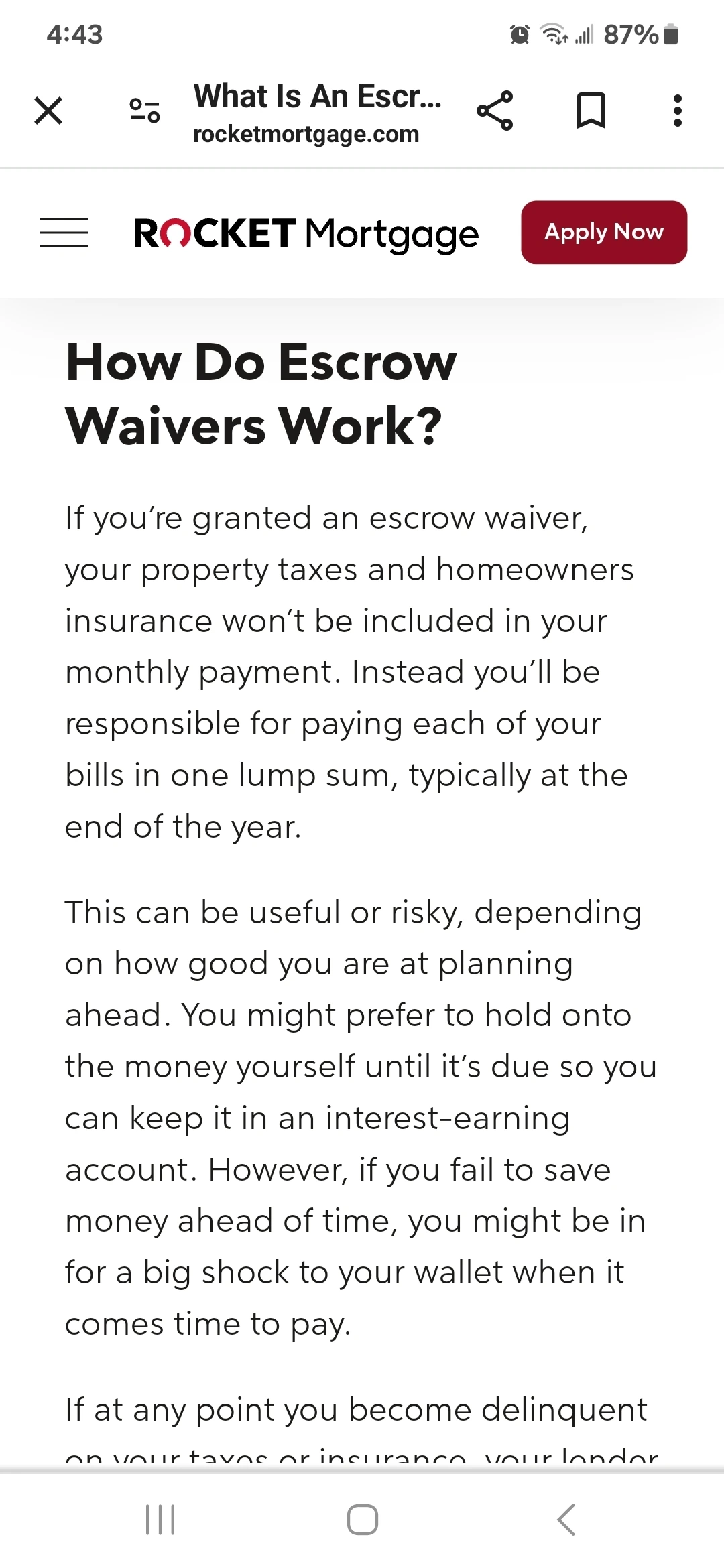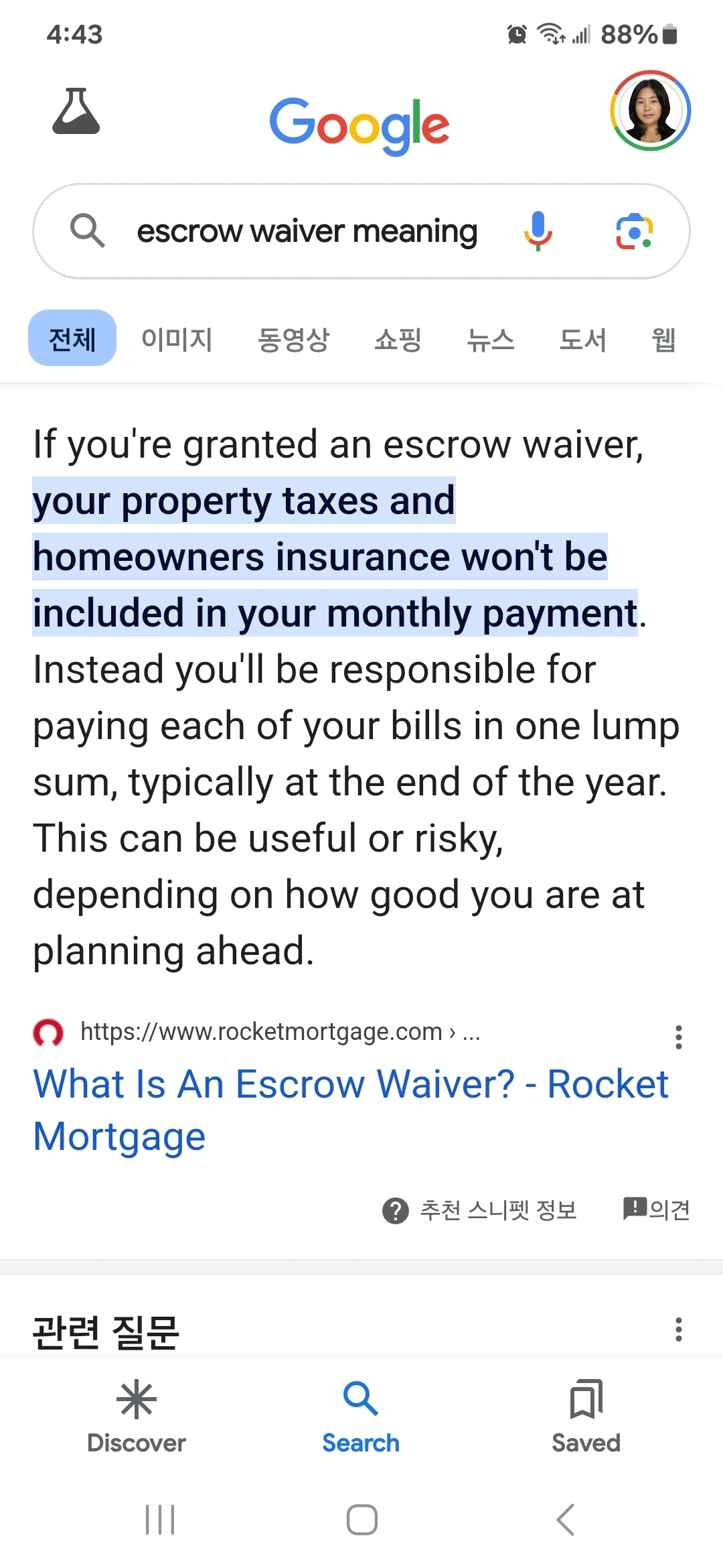 모기지내역으로는 대출원금. 이자. 집보험. 택스 이렇게 알고 있는데, 우린 몇 달 뒤에 들어올 돈이 있어서 escrow waiver를 신청했다. 내가 보험업을 하기 때문에 직접 보험을 들었고. 택스는 1년에 두 번 낸다고 들었다.