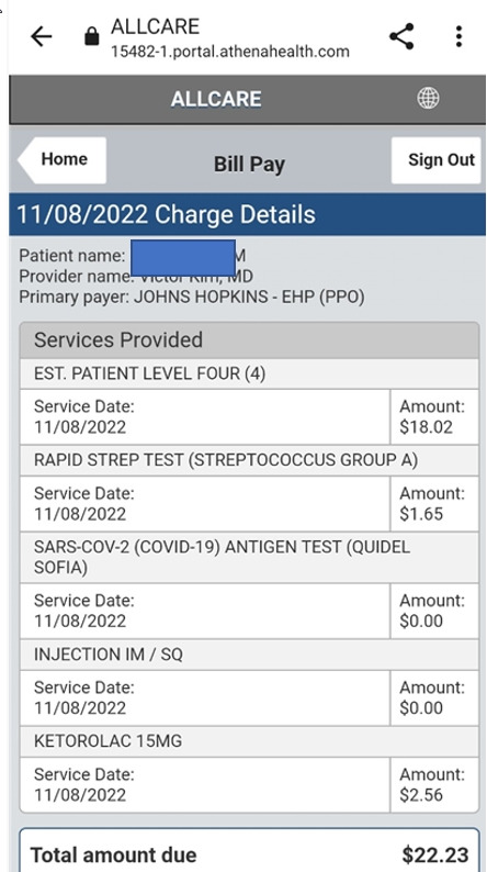 나 : 나도 상반기에 디덕터블 150불을 지불한 적이 있어서, 이번 청구서에는 코페이만 내면 된다. 나는 21.32달러가 청구되었다. 나도 독감인것 같아서 검사를 했으나, 그냥 단순 몸살이였다. 아래의 내역에 보면 ketorolac 15MG이라고 있는데, 이것이 통증을 완화시켜주는 진통제 주사이다. 이걸 놔달라고 했는데, 안해줬다.